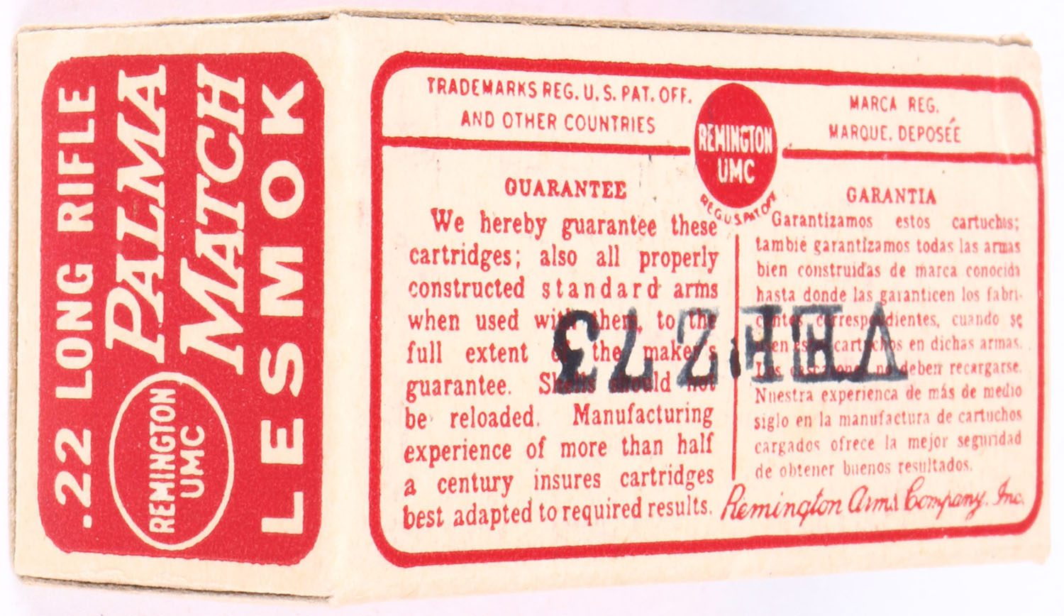 Remington, Palma Match, .22 Long Rifle, RHWeb: REM-52 LR-5a, Full, 1pc. Red & off-white box, box is near mint with minty color, only has one small stain on top, corners are mostly sharp, edges are crisp, end flaps are solid, ammo is very good to excellent. Grade: Excellent ++ - Value: 10 to 50