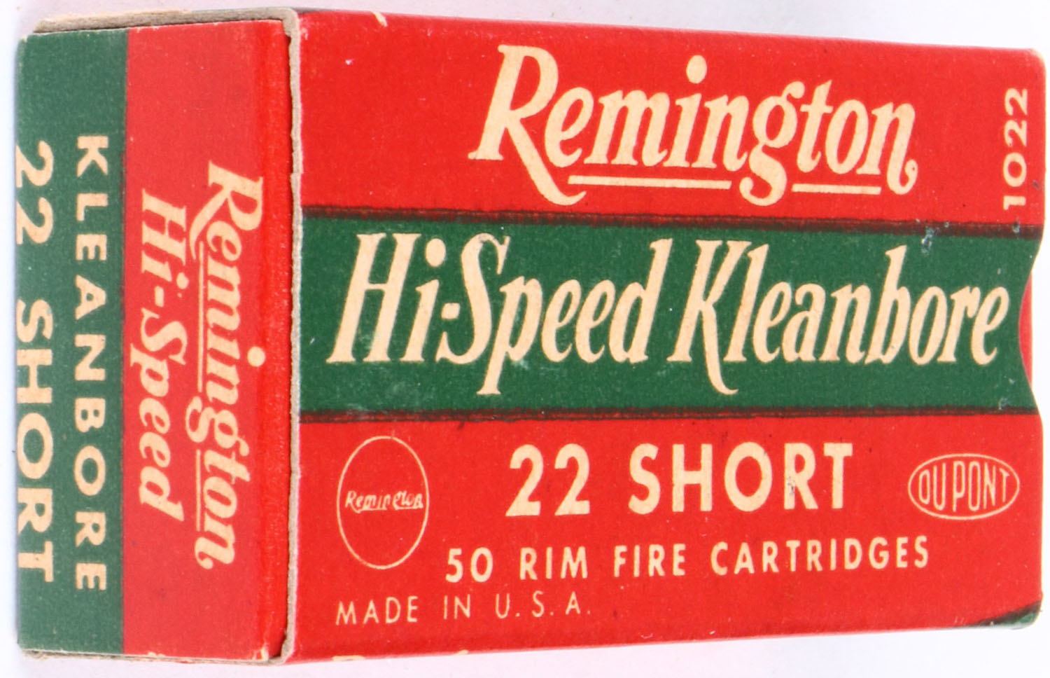 Remington, Hi-Speed Kleanbore, .22 Short, RHWeb: REM-14 S-1c, Full, 1pc. Red green & white box, box is solid with excellent color, very minor age soiling, corners are sharp, edges are crisp, end flaps are solid, ammo is minty. Grade: Excellent ++ - Value: 10 to 50