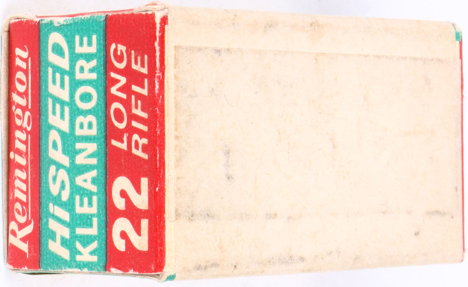 Remington, Hi-Speed Kleanbore, .22 Long Rifle Dummy Cartridges, Not in RHWeb, Full, 1pc. Red green & white box with white & green over label, box is solid with excellent color, some age soiling to top of label, very minor corner wear, edges are crisp, end flaps are solid, ammo is excellent. Grade: Excellent + - Value: 6 to 30