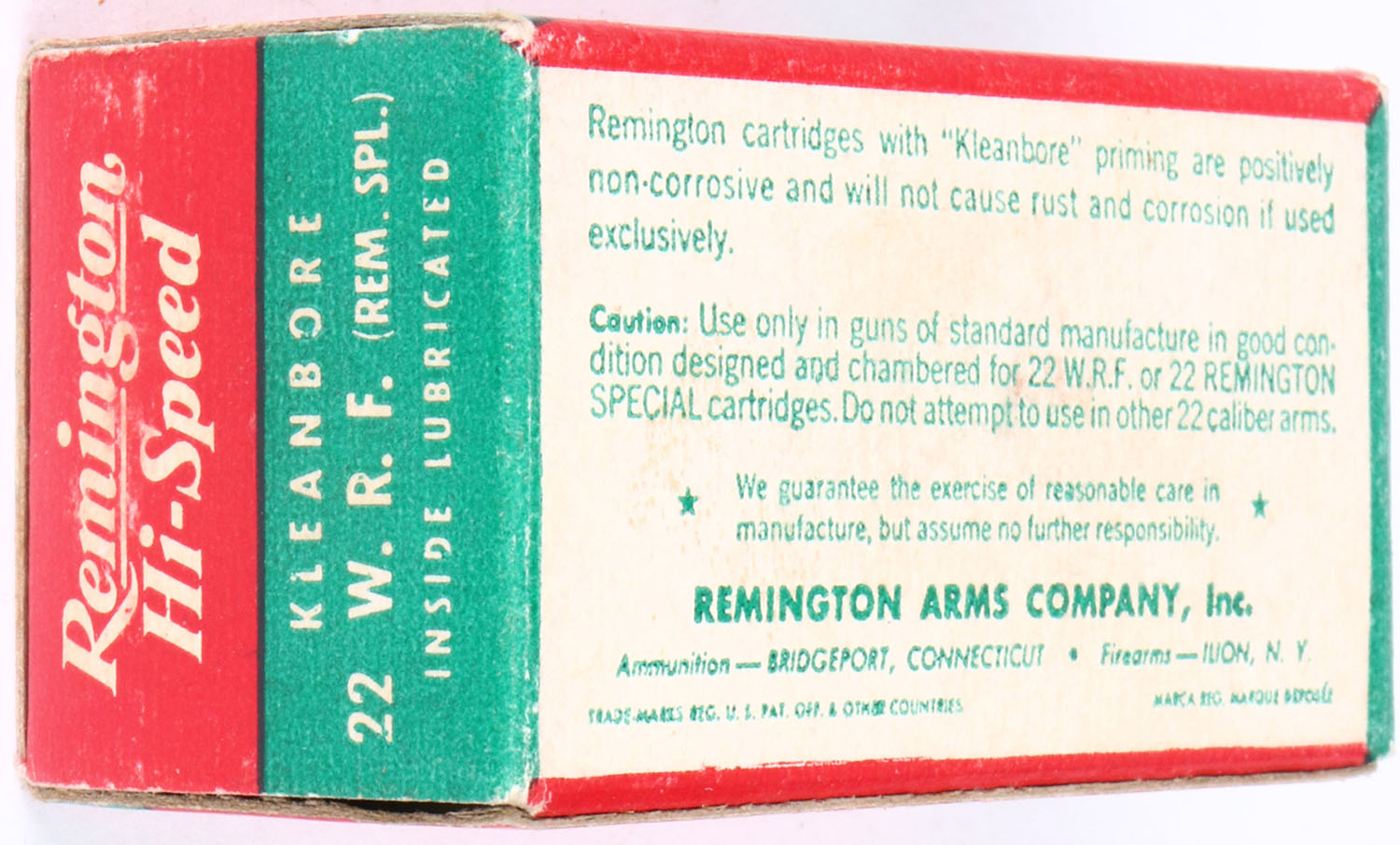 Remington, Hi-Speed Kleanbore, .22 W.R.F. (Rem. Spl.), RHWeb: REM-14 WRF-1c, Full, 1pc. Red green & white box, box is solid with minty color, very minor corner wear, edges are crisp, end flaps are solid, ammo is excellent. Grade: Excellent ++ - Value: 10 to 50