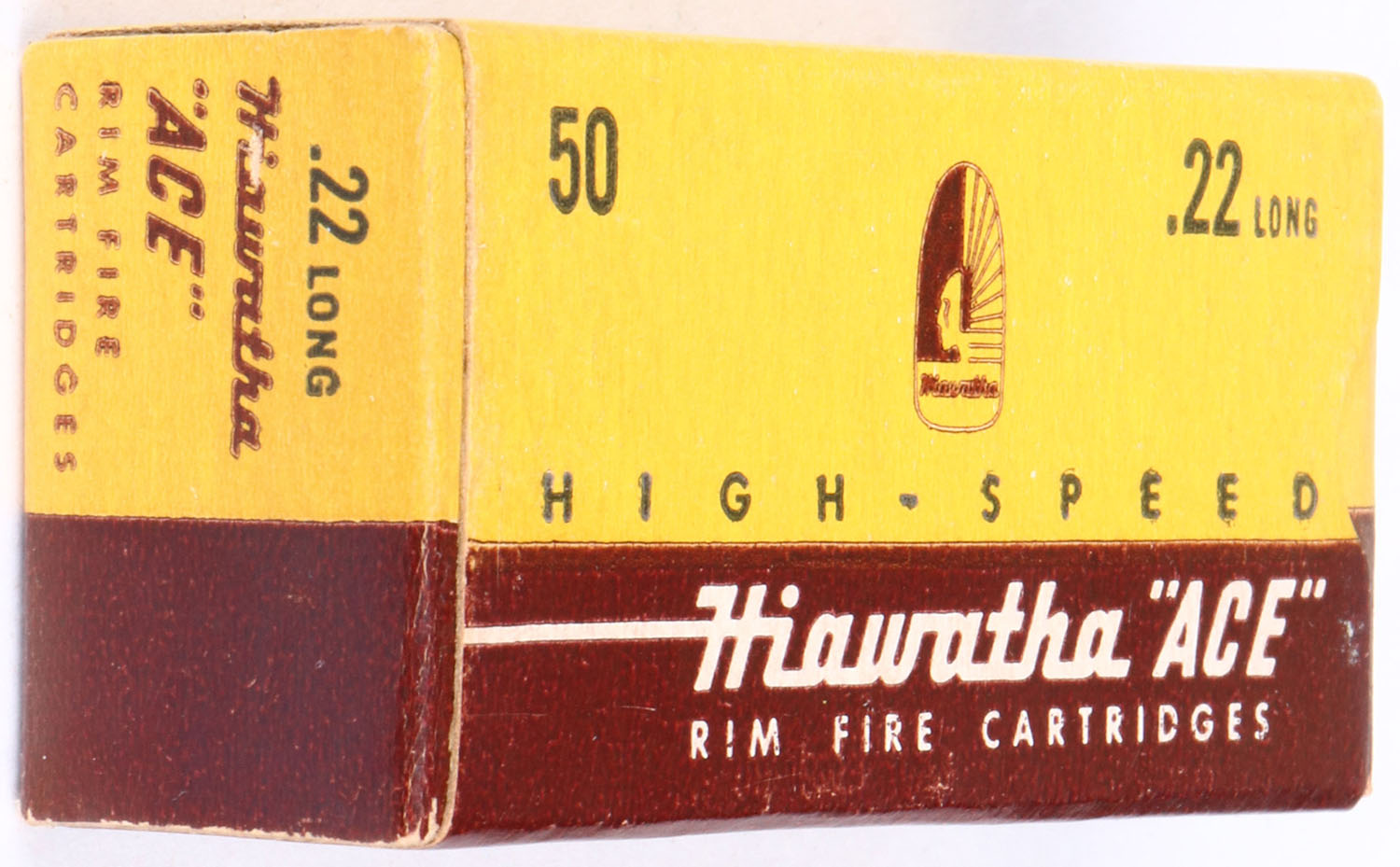 Gambles, Hiawatha ''Ace'', .22 Long, High-Speed, RHWeb: GS-2 L-1, Full, 1pc. Yellow & brown box, box is solid with excellent color, only very minor age soiling, corners are mostly sharp, edges are crisp, end flaps are solid, ammo is excellent. Grade: Excellent ++ - Value: 20 to 60