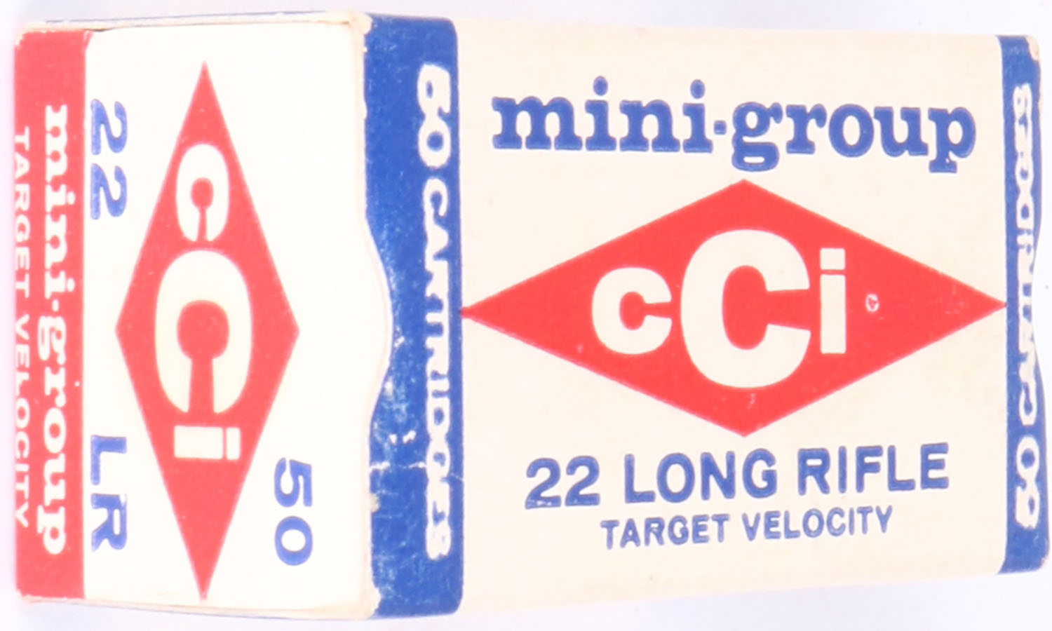 CCi, mini-group, .22 Long Rifle, RHWeb: CCI-1 LR-18, Full, 1pc. White blue & red box, box is solid with minty color, only very minor age soiling, corners are sharp, edges are crisp, end flaps are rigid, ammo is excellent. Grade: Excellent ++ - Value: 4 to 20