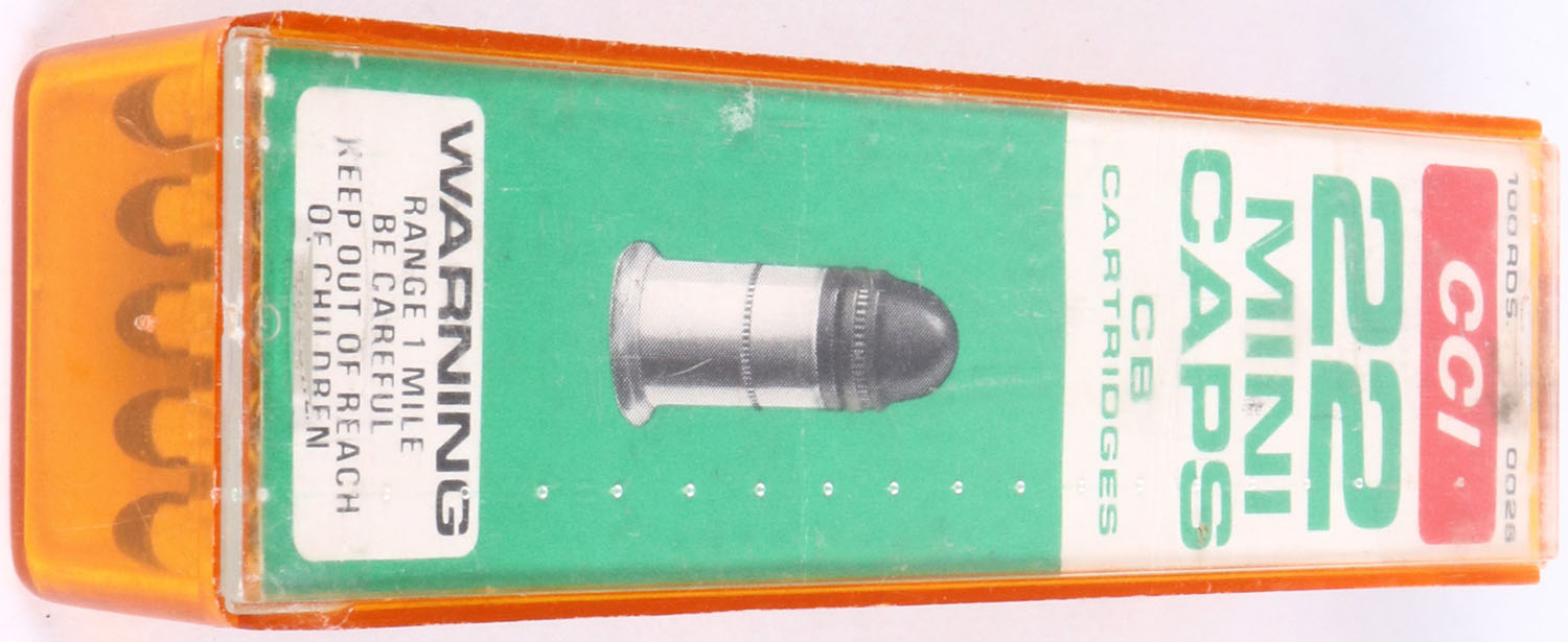 CCi, 22 Mini Caps, .22 C.B. Caps, RHWeb: CCI-6 SCB-1a, Full, 2pc. Amber and clear plastic tray with green & white inside label, box is has a small crack on left end, slightly cloudy, label has excellent color ammo is minty. Grade: Excellent - Value: 8 to 40