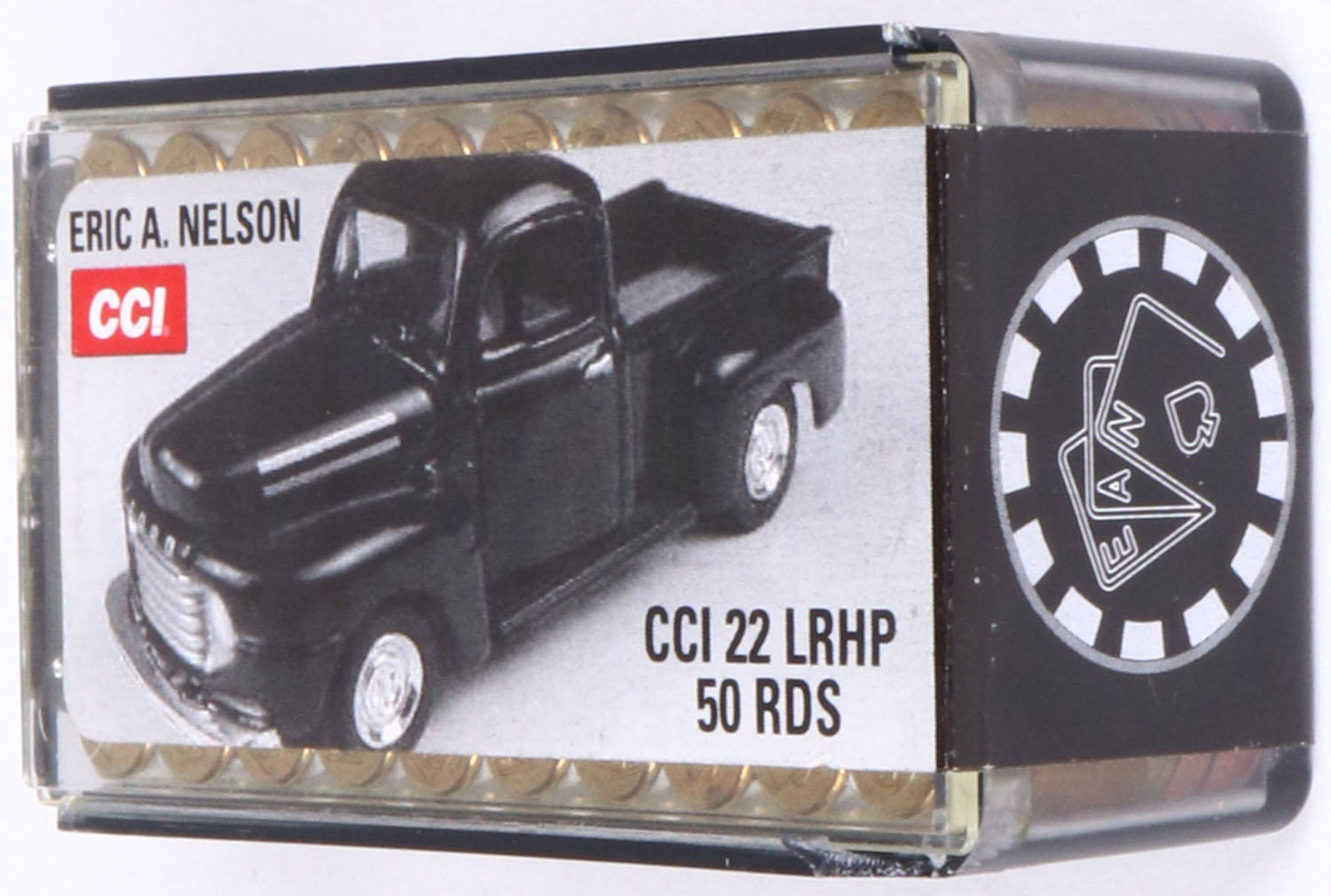 CCi, Eric A. Nelson Retirement Commemorative box, .22 Long Rifle Hollow Point, FULL & SEALED, 2pc. Smoke & clear plastic tray with black and gray sealing label, box is near mint with minty color, only has one small chip on front right corner, label is intact, ammo appears minty. Grade: Excellent ++ - Value: 30 to 120