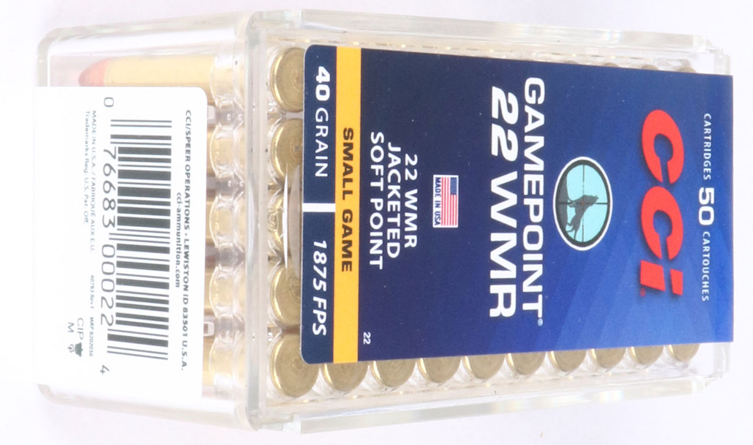 CCi, GamePoint, .22 WMR, 40 Grain Jacketed Soft Point, 1875 FPS, FULL & SEALED, 2pc clear plastic tray with multi-colored sealing label, box and label are MINT, label is intact, ammo appears mint. Grade: MINT - Value: 10 to 50