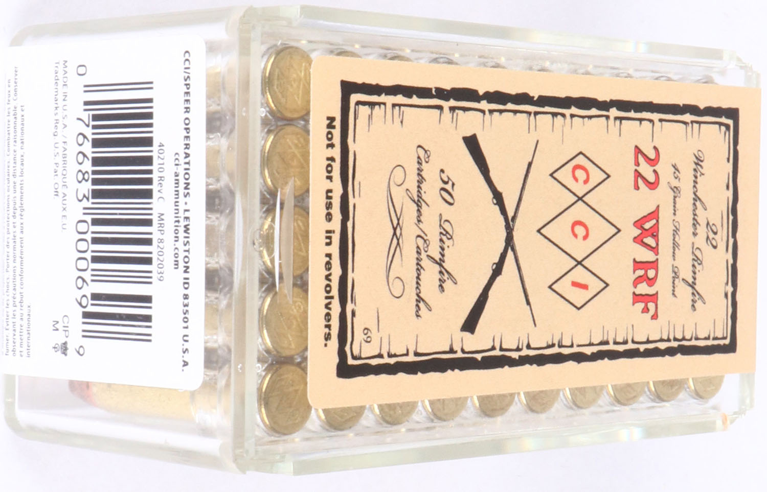 CCi, .22 WRF Hollow Point, FULL & SEALED, 2pc. Clear plastic tray with tan sealing label, box and label are mint, ammo appears minty. Grade: MINT - Value: 10 to 50