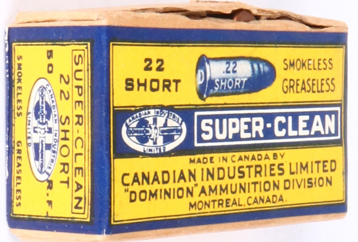 C.I.L., Super-Clean, .22 Short, Smokeless Greaseless, FULL & SEALED, 2pc. Buff box with yellow blue & white wraparound label, box has full seam splits on top and bottom back side edges, very minor shelf wear, on bottom, box has excellent to minty color, corners are sharp, label is intact. Grade: Very Good - Value: 10 to 50
