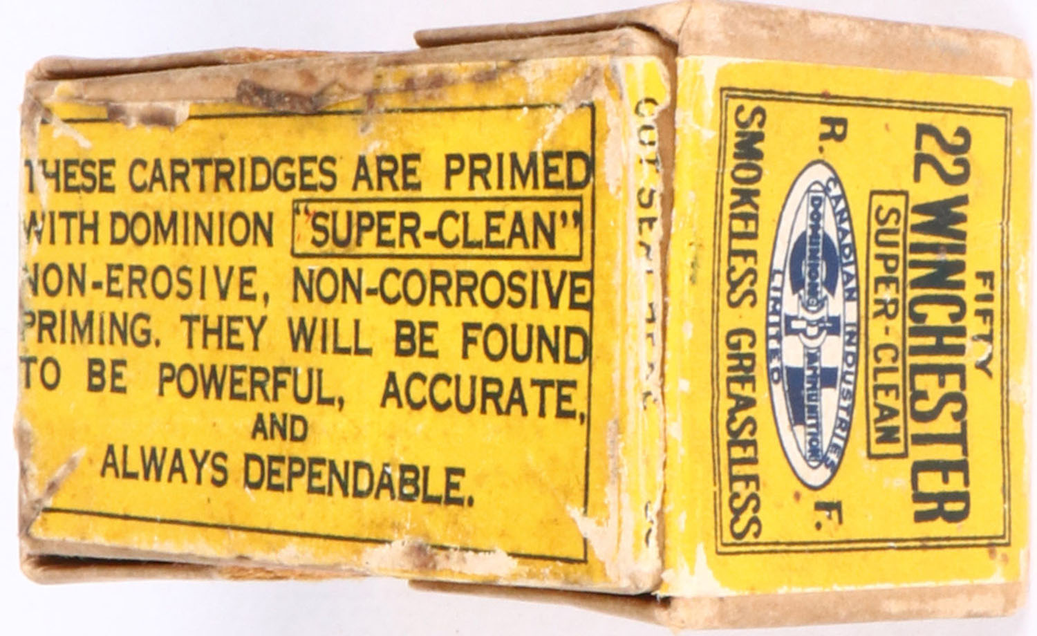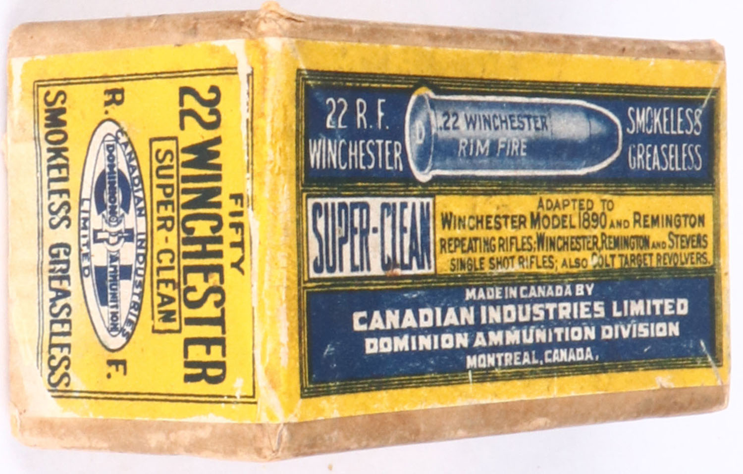 C.I.L., Super-Clean, .22 Winchester Rim Fire, Smokeless Greaseless, Full, 2pc.. Buff box with blue yellow & white wraparound label, box is solid with excellent color, minor age soiling, some shelf wear, very minor edge & corner wear, label is intact, ammo is excellent. Grade: Excellent - Value: 10 to 50