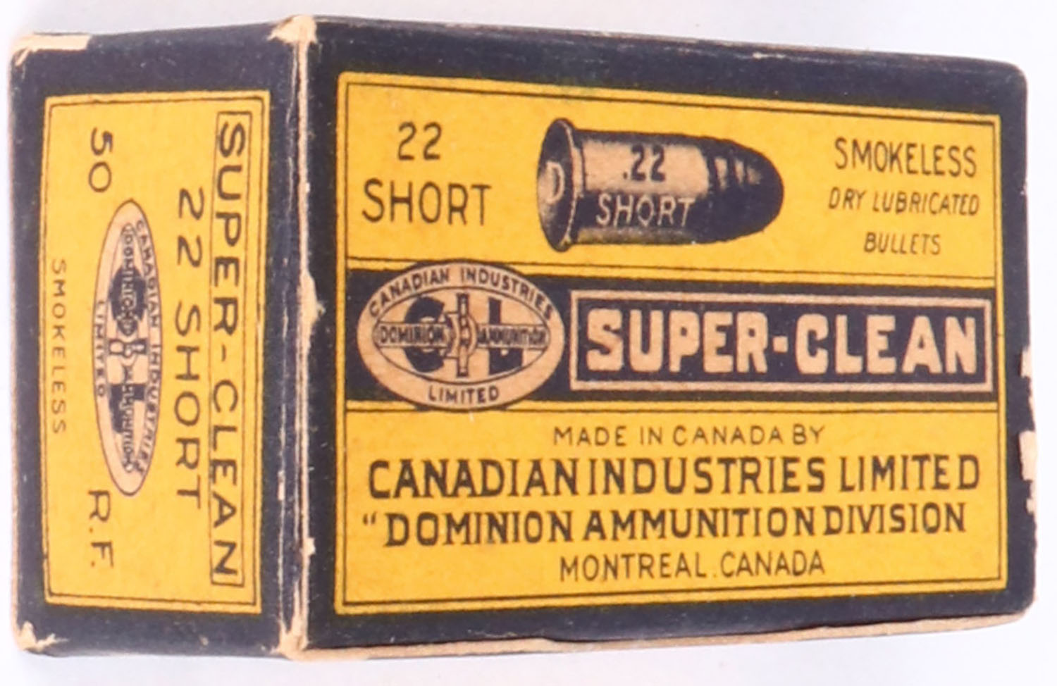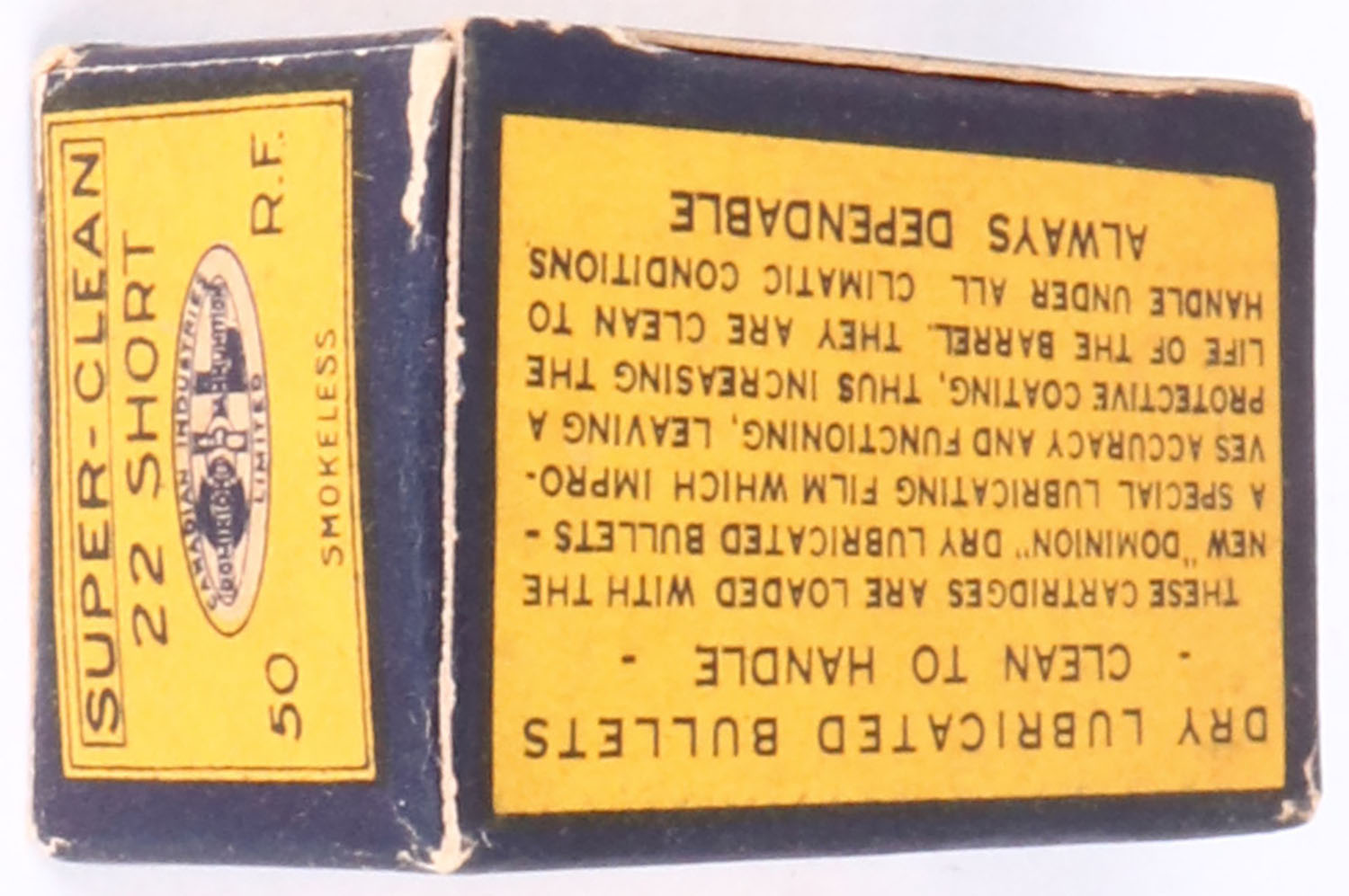 C.I.L., .22 Short, Super-Clean, Smokeless Dry Lubricated, Full, 1pc. Yellow blue & white box, box is solid with excellent color, very minor age soiling & edge wear, corners are mostly sharp, top flap is solid, ammo is excellent. Grade: Excellent + - Value: 8 to 40