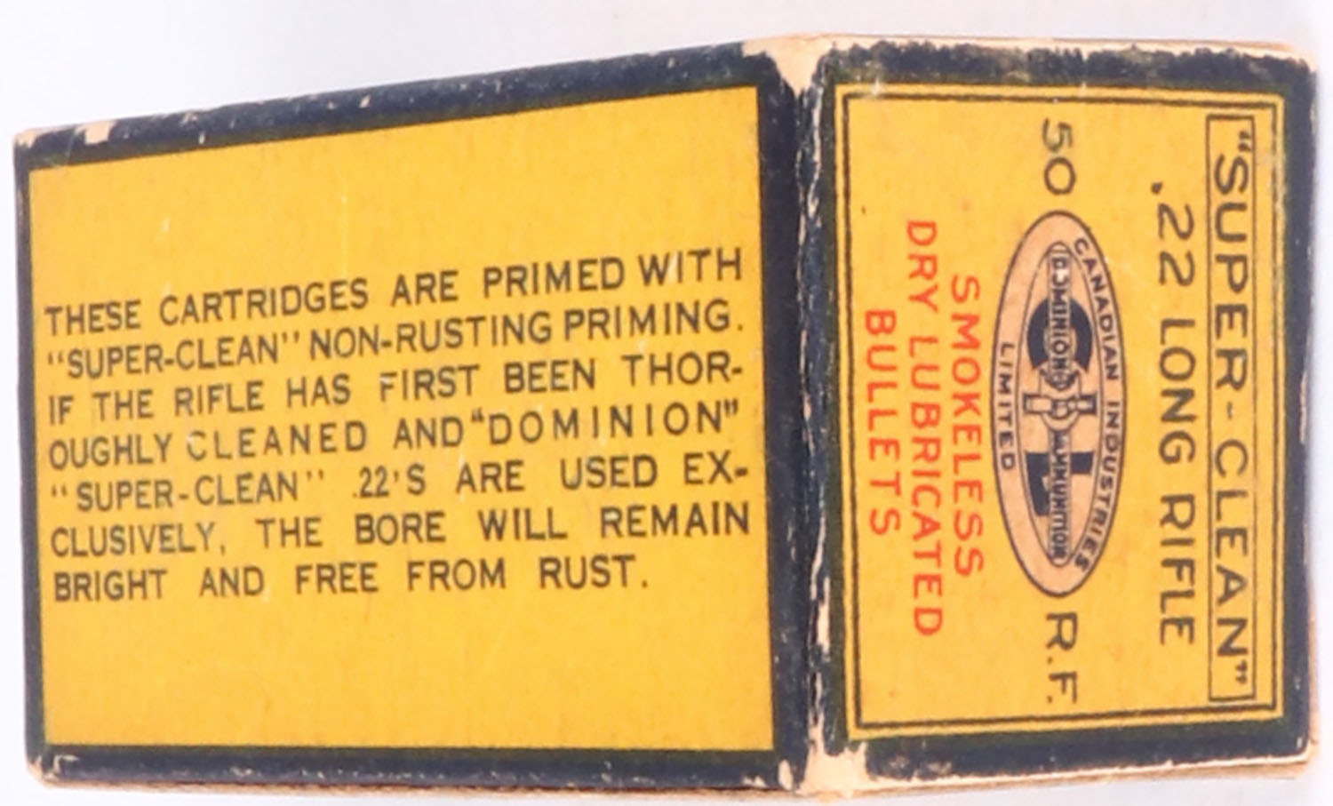 C.I.L., Super-Clean, .22 Long Rifle, Smokeless Dry Lubricated, Full, 1pc. Yellow blue & white box, box is solid with excellent color, minor age soiling, some edge & corner wear, end flaps are solid, ammo is excellent. Grade: Excellent - Value: 8 to 40