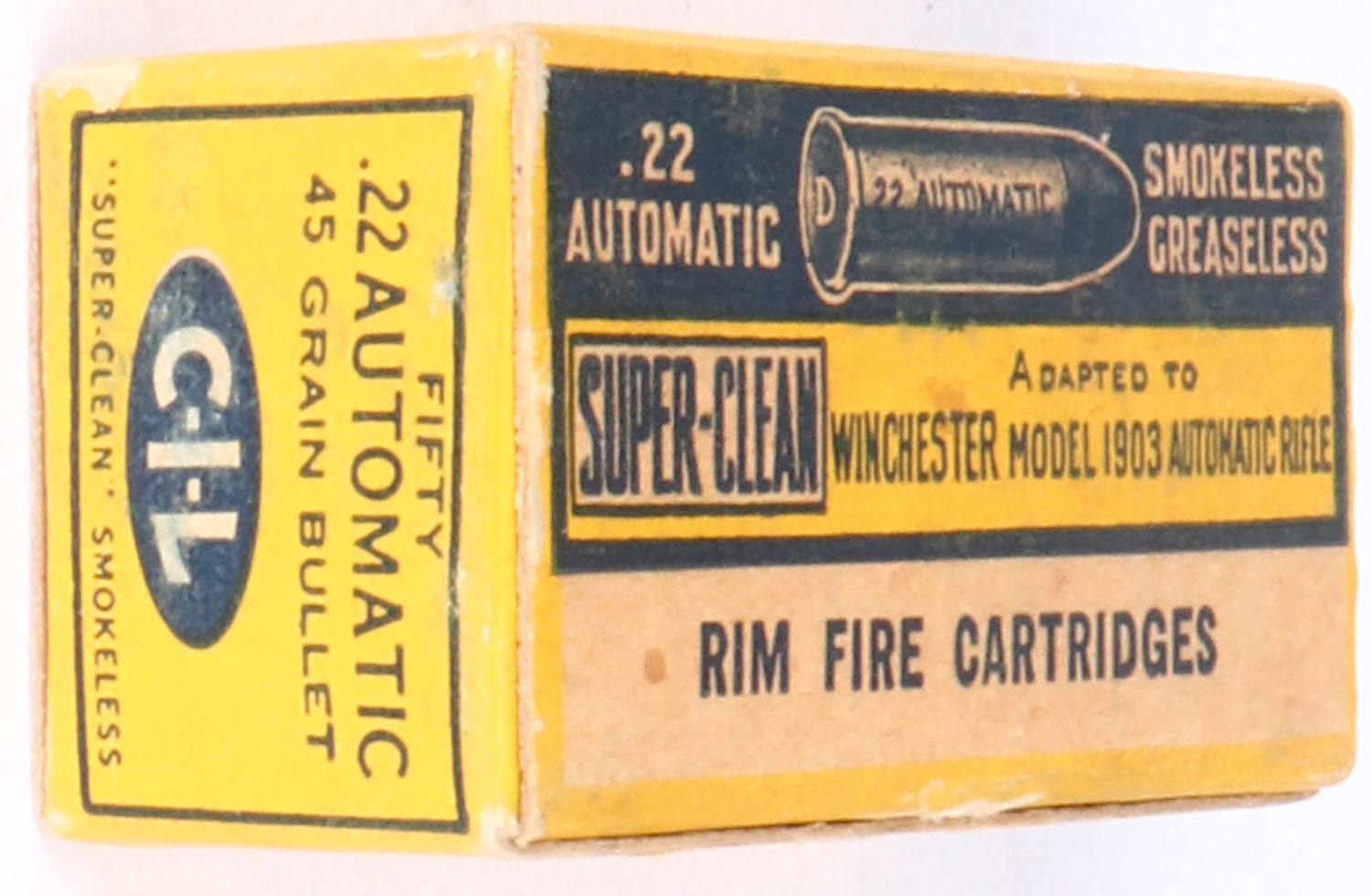 C.I.L., Super-Clean, .22 Automatic, Smokeless Greaseless, Full, 1pc. Yellow blue & buff box, box is solid with excellent color, very minor age soiling, very minor edge & corner wear, top flap is solid, ammo is excellent. Grade: Excellent - Value: 10 to 50