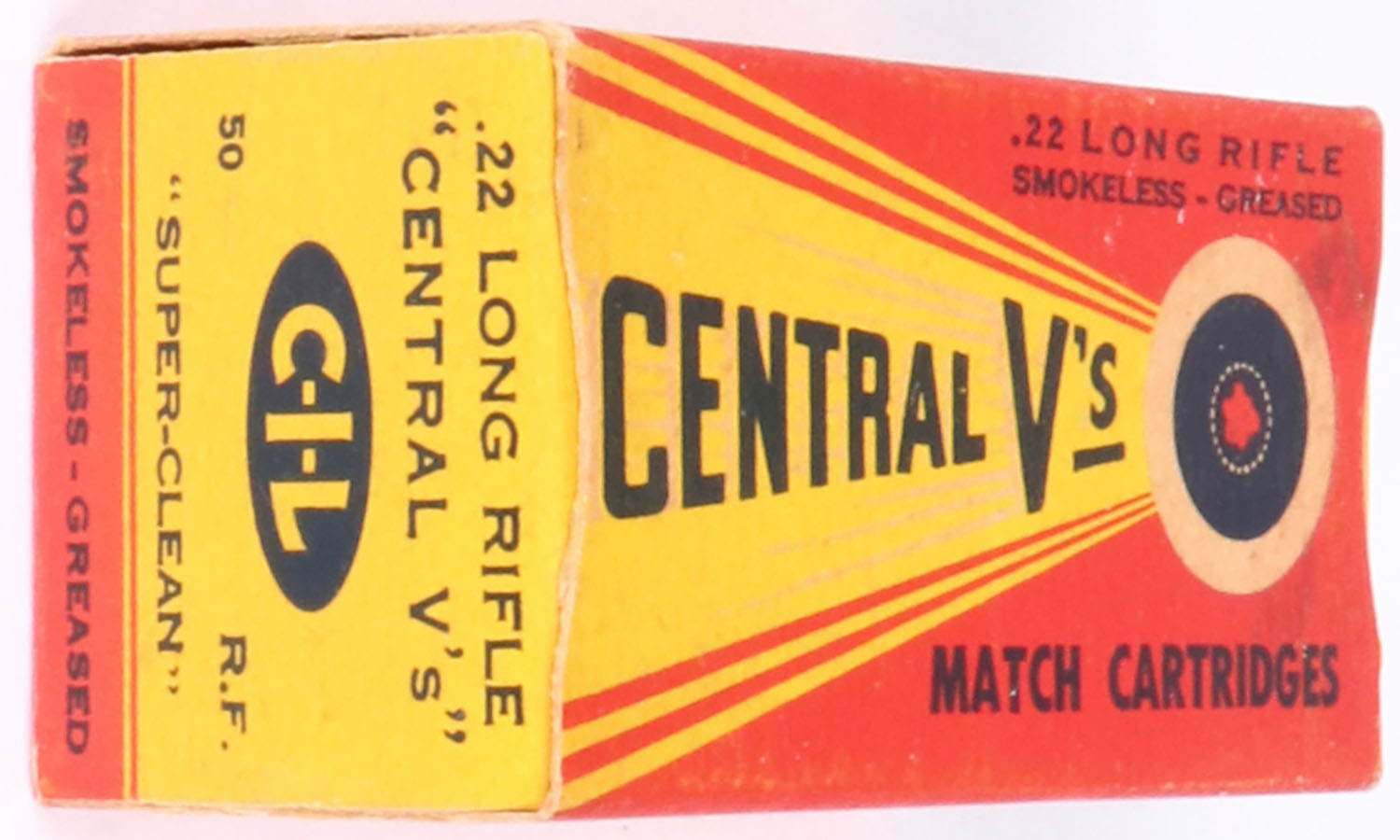 C.I.L., Central V's, .22 Long Rifle, Match Cartridges, Full, 1pc. Yellow & red box, box is solid with excellent color, very minor age soiling & staining to top, corners are mostly sharp, edges are crisp, end flaps are solid, ammo is very good to excellent. Grade: Excellent + - Value: 10 to 50