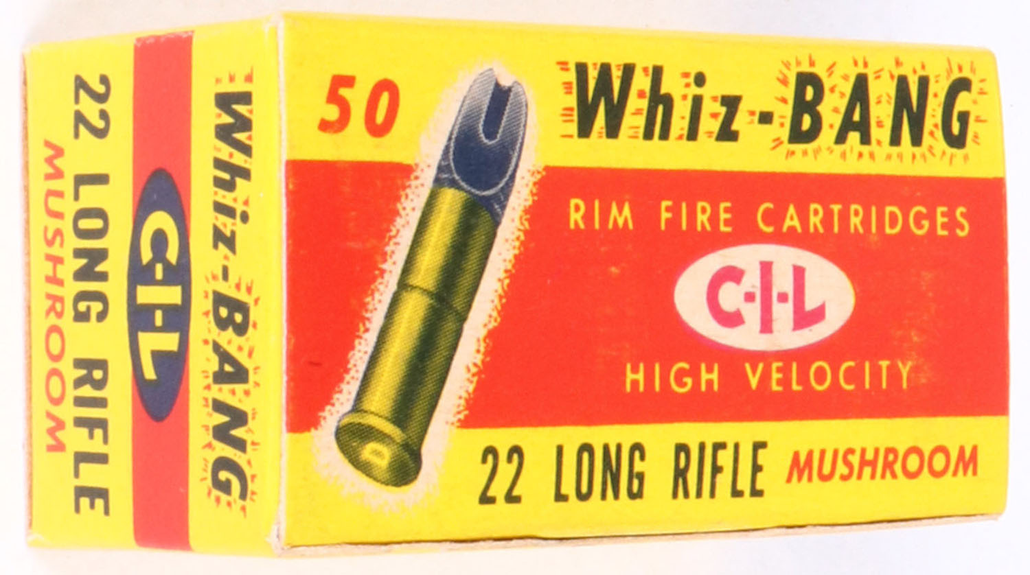 C.I.L., Whiz-Bang, .22 Long Rifle Hollow Point, High Velocity Mushroom, Full, 1pc. Yellow & red box, box is MINT with minty color, corners are sharp, edges are crisp, top flap is solid, ammo is excellent. Grade: MINT - Value: 20 to 60