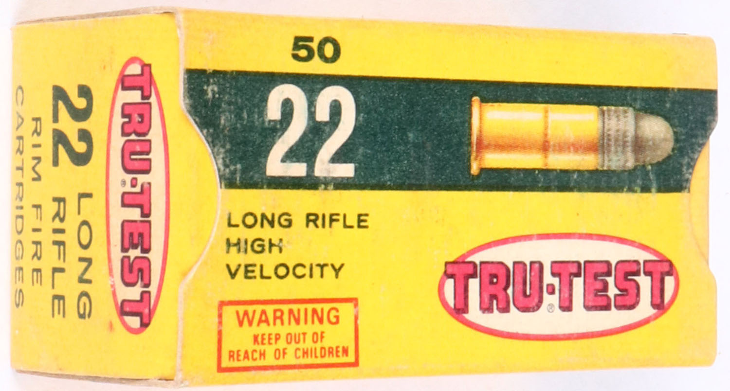 Tru Value, Tru-Test, .22 Long Rifle, High Velocity, Full, 1pc. Yellow green & red box, box is solid with excellent color, very minor shelf wear and color fading, corners are mostly sharp, edges are crisp, end flaps are solid, ammo is excellent. Grade: Excellent ++ - Value: 10 to 50