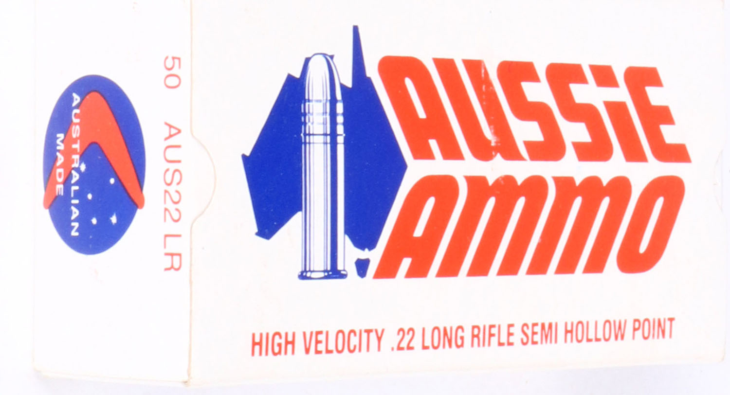 Winchester (Australia), Aussie Ammo, .22 Long Rifle Semi Hollow Point, High Velocity, Full, 1pc. White red & blue box, box is near mint with excellent to minty color, only very minor age soiling, corners are sharp, edges are crisp, end flaps are solid, ammo is minty. Grade: Excellent ++ - Value: 20 to 60