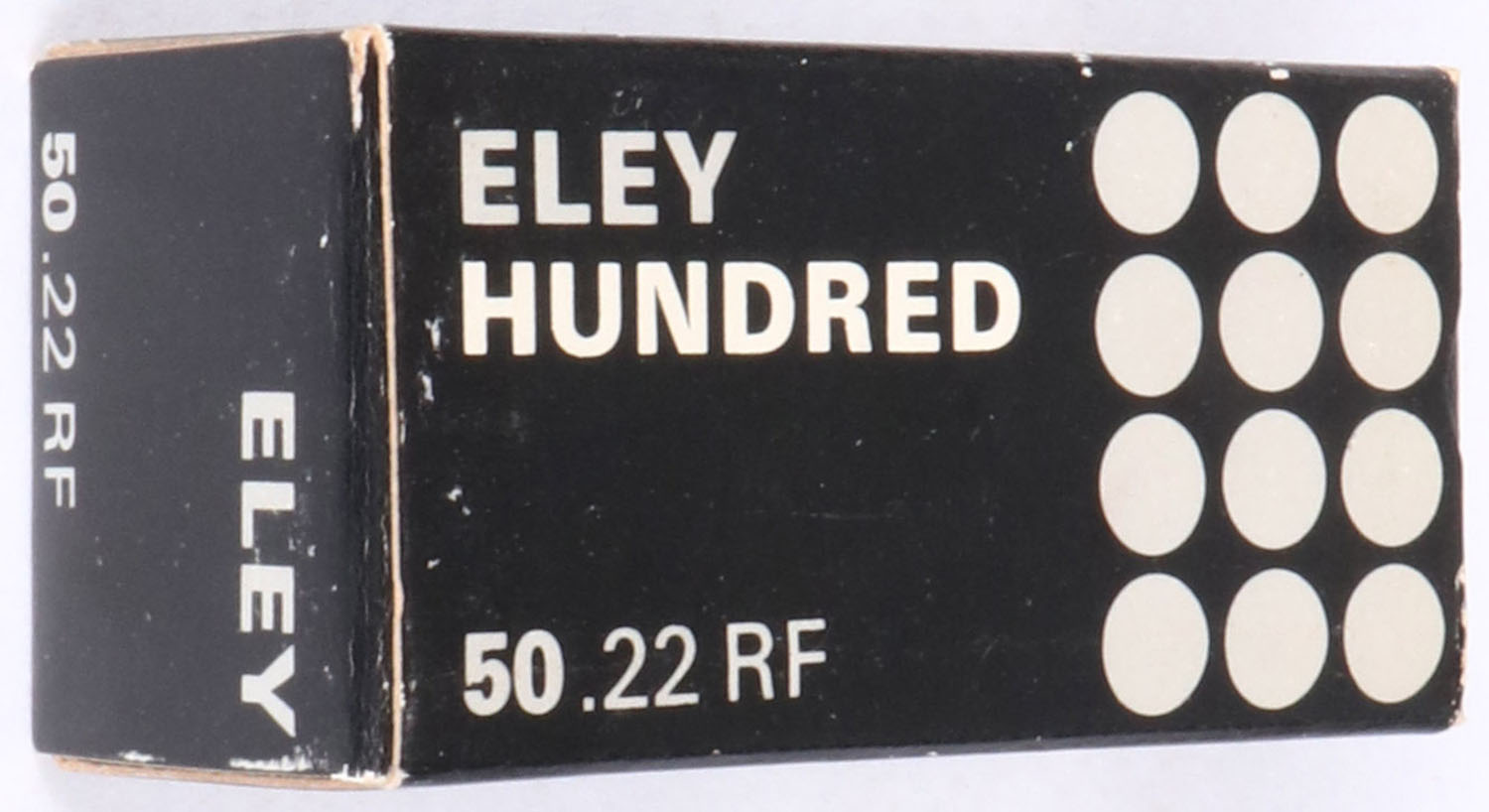 Eley, Hundred, .22 Long Rifle, Full, 1pc. Black gray and white box, box is solid with excellent to minty color, only very minor shelf & corner wear, edges are crisp, end flaps are solid, ammo is excellent. Grade: Excellent ++ - Value: 10 to 50
