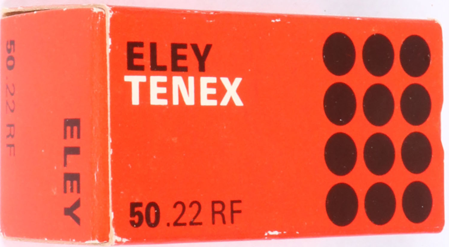 Eley, Tennex, .22 Long Rifle, Full, 1pc. Orange black & white box, box is solid with minty color, only very minor shelf & corner wear, edges are mostly crisp, end flaps are solid, ammo is excellent. Grade: Excellent ++ - Value: 10 to 50