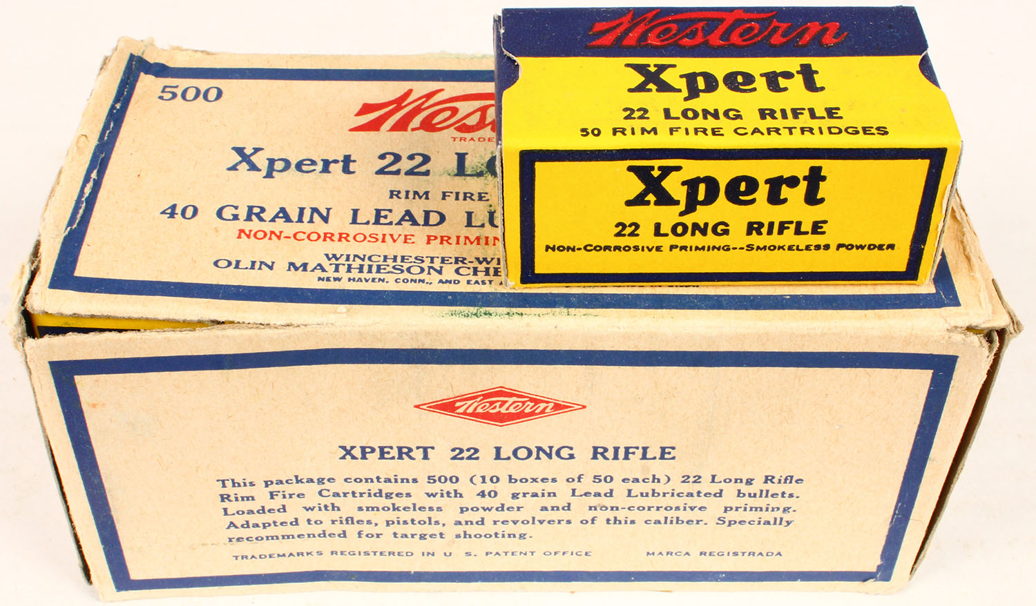 Western, Xpert, .22 Long Rifle, Greased, Full, 500rds. 1pc. Buff blue & red brick, brick has excellent color, left end flap is torn and taped, partial seam splits to top and bottom front edges, partial seam split to top back edge, some corner wear, right end flap is solid, inside boxes are mint. Grade: Very Good + - Value: 50 to 150