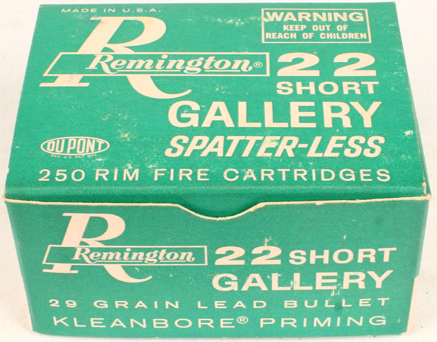 Remington, Spatter-Less, .22 Short, Gallery, Full, 250rds., 1pc. Green & white bulk box, box is solid with excellent color, minor shelf wear, corners are sharp, edges are crisp, top flap is solid, ammo is excellent. Grade: Excellent ++ - Value: 30 to 120