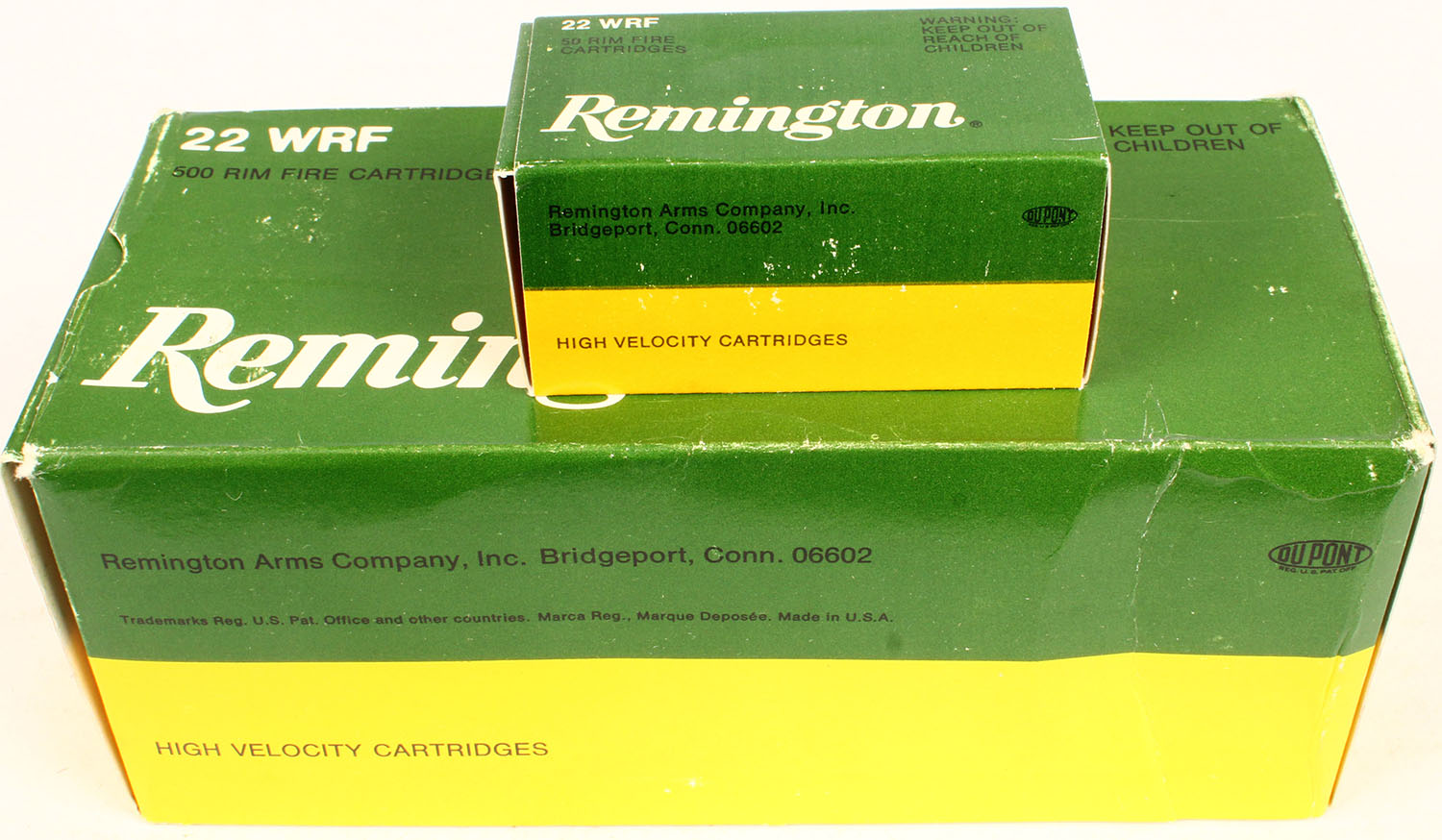 Remington, High Velocity Cartridges, .22 WRF, Full, 500rds., 1pc. Green yellow & white brick, brick is solid with excellent to minty color, very minor shelf wear, minor edge & corner wear, end flaps are solid, inside boxes are minty. Grade: Excellent + - Value: 50 to 150