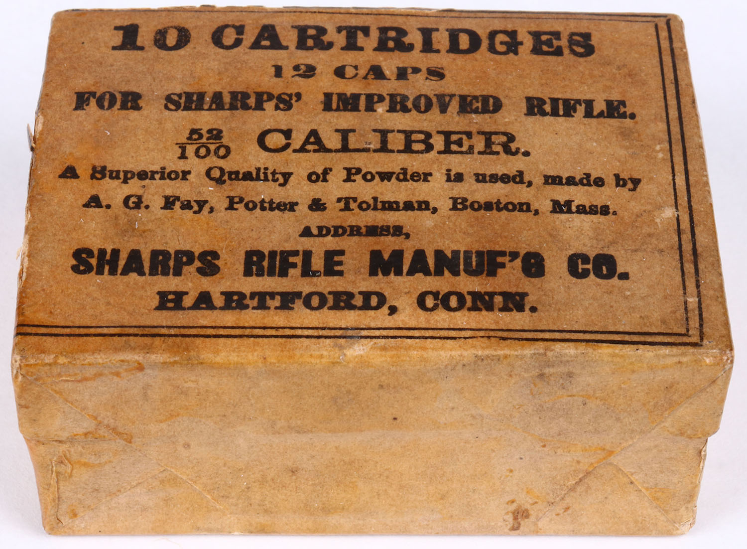 Sharps Rifle Manuf'g Co., 52/100 Caliber, For Sharps' Improved Rifle, FULL & SEALED 2pc. Box wrapped in a buff & black paper package, box is solid with very good color, age soiling, minor chipping & tearing to outer packaging, very minor corner wear, edges are mostly crisp, outer packaging is 99% intact. Grade: Excellent + - Value: 400 to 800
