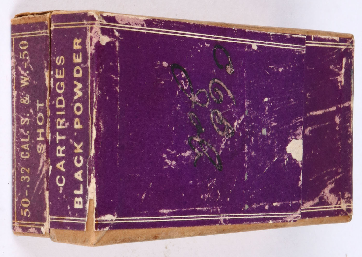 Robin Hood, .32 S&W shot cartridges, Black powder, 2pc, Full, buff box with purple label & white print, box is solid with faded top label, small tear in bottom left end label, rub marks, one corner seam split on lid, light age soiling, corners & edges are solid, ammo is good. Grade: Very Good ++ - Value: 80 to 160