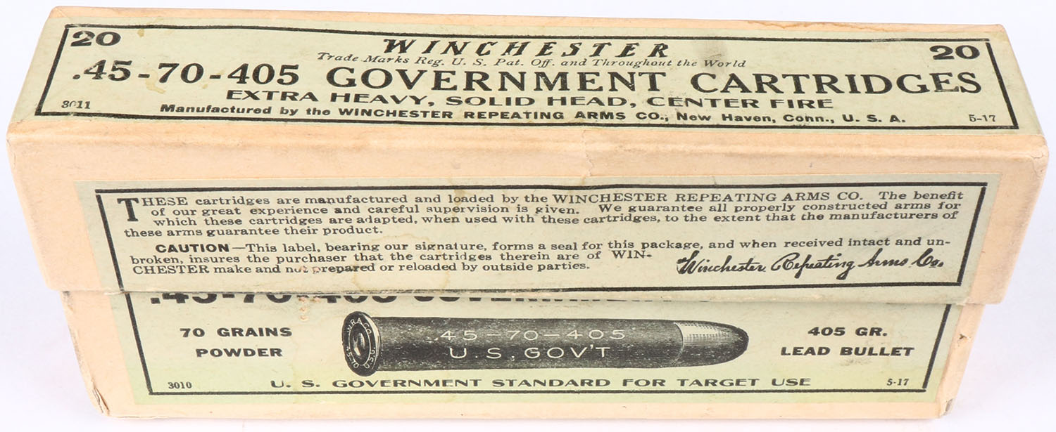 Winchester, .45-70-405 Government Cartridges, FULL & SEALED, 2pc. Buff box with green labels & black print, box is solid with very minor edge & shelf wear, two split end seams on bottom box & one partial split seam on back of bottom box. Grade: Excellent - Value: 100 to 300