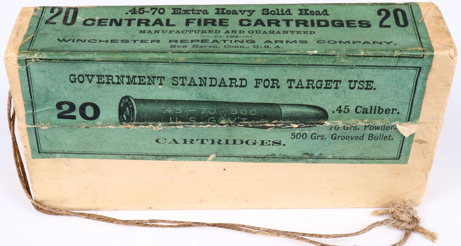 Winchester, .45-70 Extra Heavy Solid Head, Government Standard for Target Use, 500 Gr. Grooved Bullet, 2pc, Full, buff box with green label & black print, box is solid with light age soiling/stains, sticker mark, rub marks, & light edge wear, ammo is excellent to very good. Grade: Excellent - Value: 100 to 300
