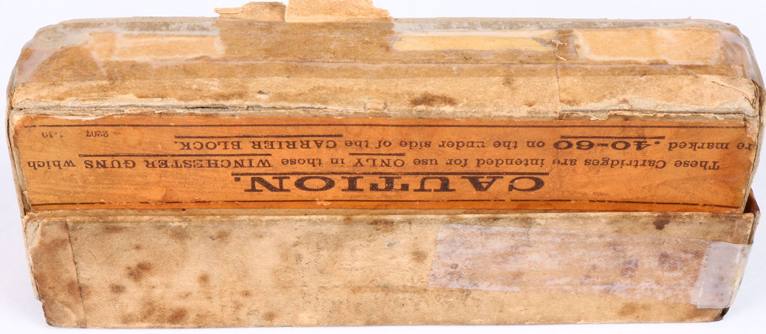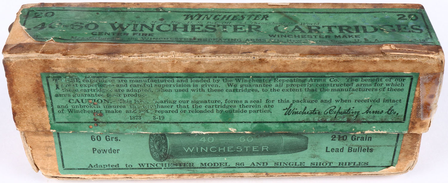 Winchester, .40-60, 210 Gr. Lead Bullet, 2pc, Full, buff box with green label & black print, box is missing left end of lid, age soiling/stains, tape seam repairs on split & partial split seams, rub marks & edge wear, ammo is very good. Grade: Good ++ - Value: 80 to 160
