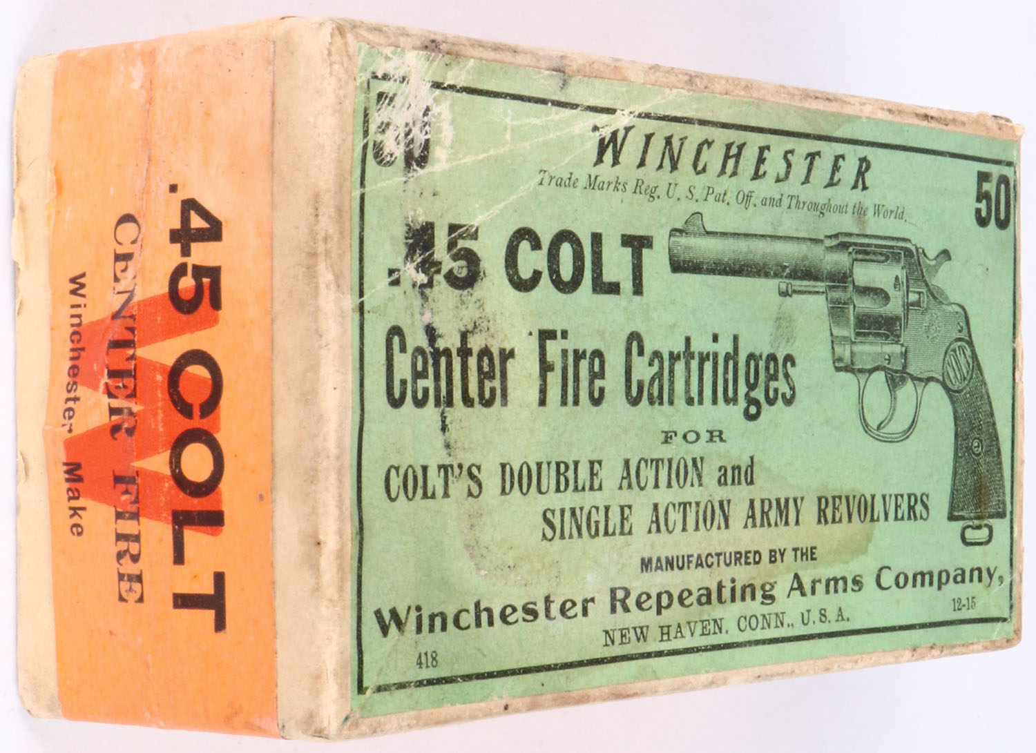 Winchester, .45 Colt, 2pc, FULL & SEALED, buff box with green/orange label & black print, box is solid with stain on front label, rub marks, & edge wear. Grade: Excellent - Value: 100 to 300