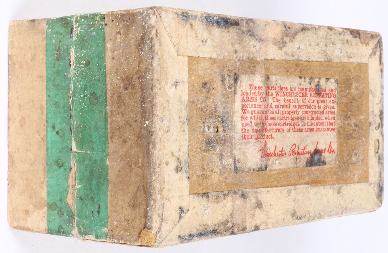 Winchester, 44 Long C.F., Central Fire Reloading, 2pc, Full, buff box with green label & black print, box is solid with light age soiling, rub marks & edge wear, ammo is poor. Grade: Very Good ++ - Value: 100 to 200