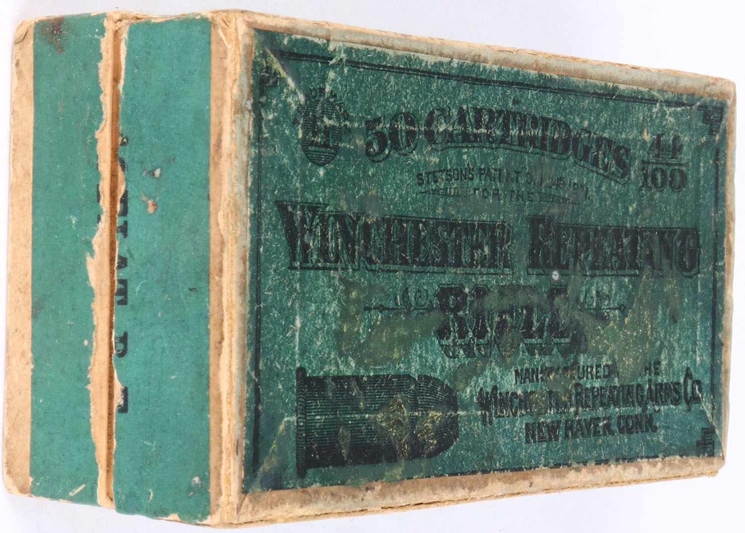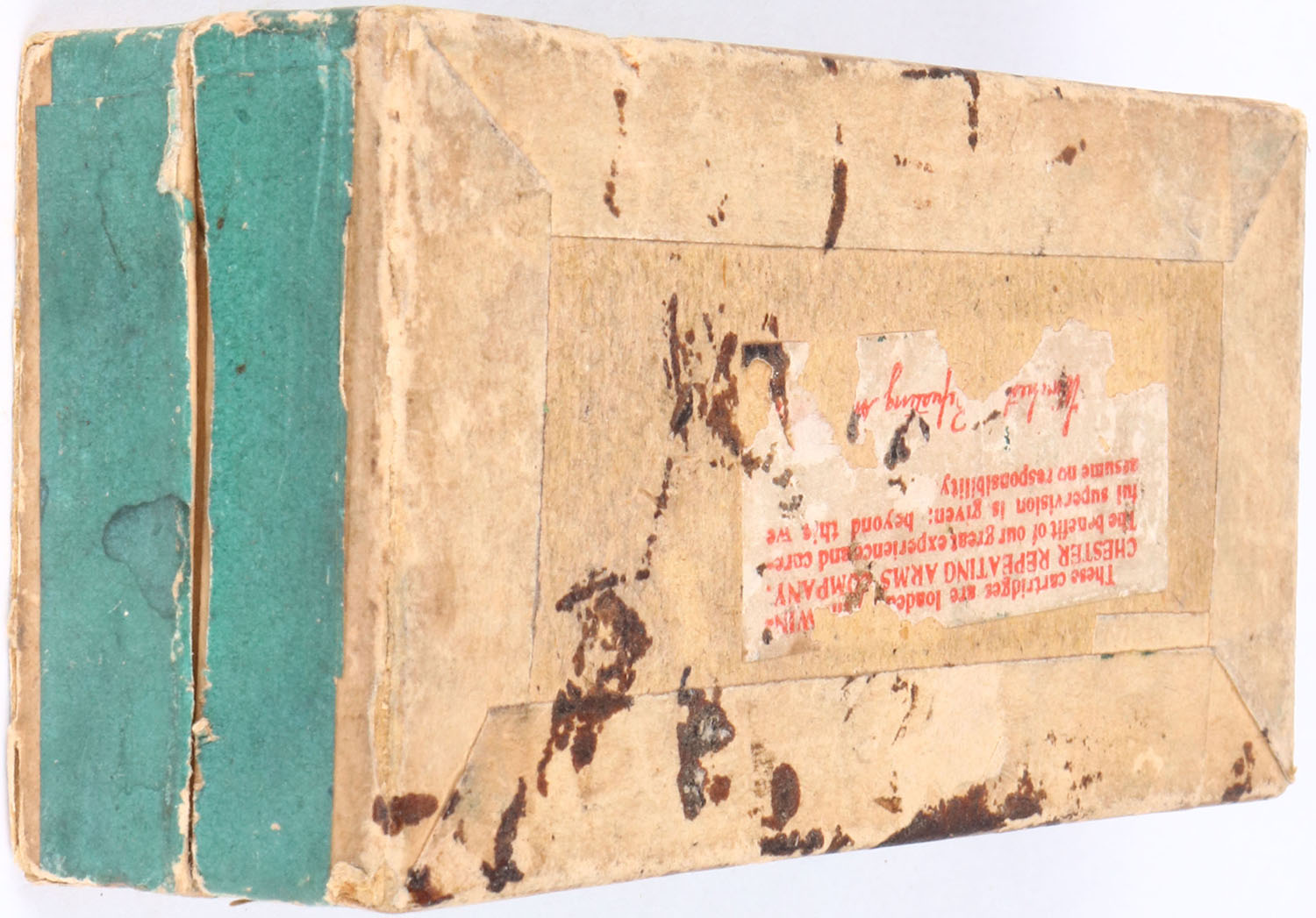 RARE & EARLY! Winchester, .44/100 (44 Flat) R.F., 1870's box, marked 44 Flat on both long sides, 2pc, partial 6 Rds., buff box with green label & black print, box is solid with faded/worn front label, age soiling, rub wear, & edge wear, ammo is very good. Grade: Very Good - Value: 800 to 2000