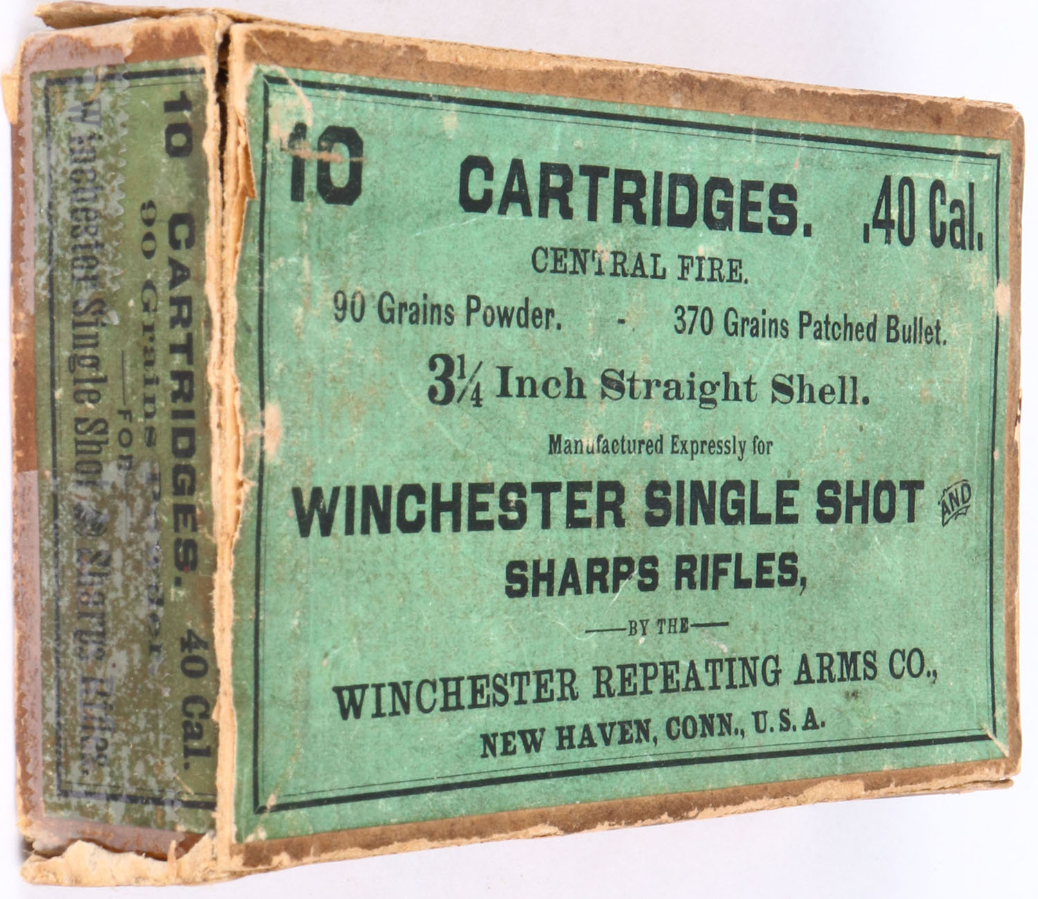 Winchester, .40 Cal, 90 Grains Powder, 370 Grains Patched Bullet, For Winchester Single Shot and Sharps Rifles, Full, 2pc. Buff box with green label & black print,, box is missing both ends of lid, has taped repaired seams, label has very good color, minor age soiling, minor edge & corner wear, label is intact, ammo is excellent. Grade: Good ++ - Value: 100 to 200
