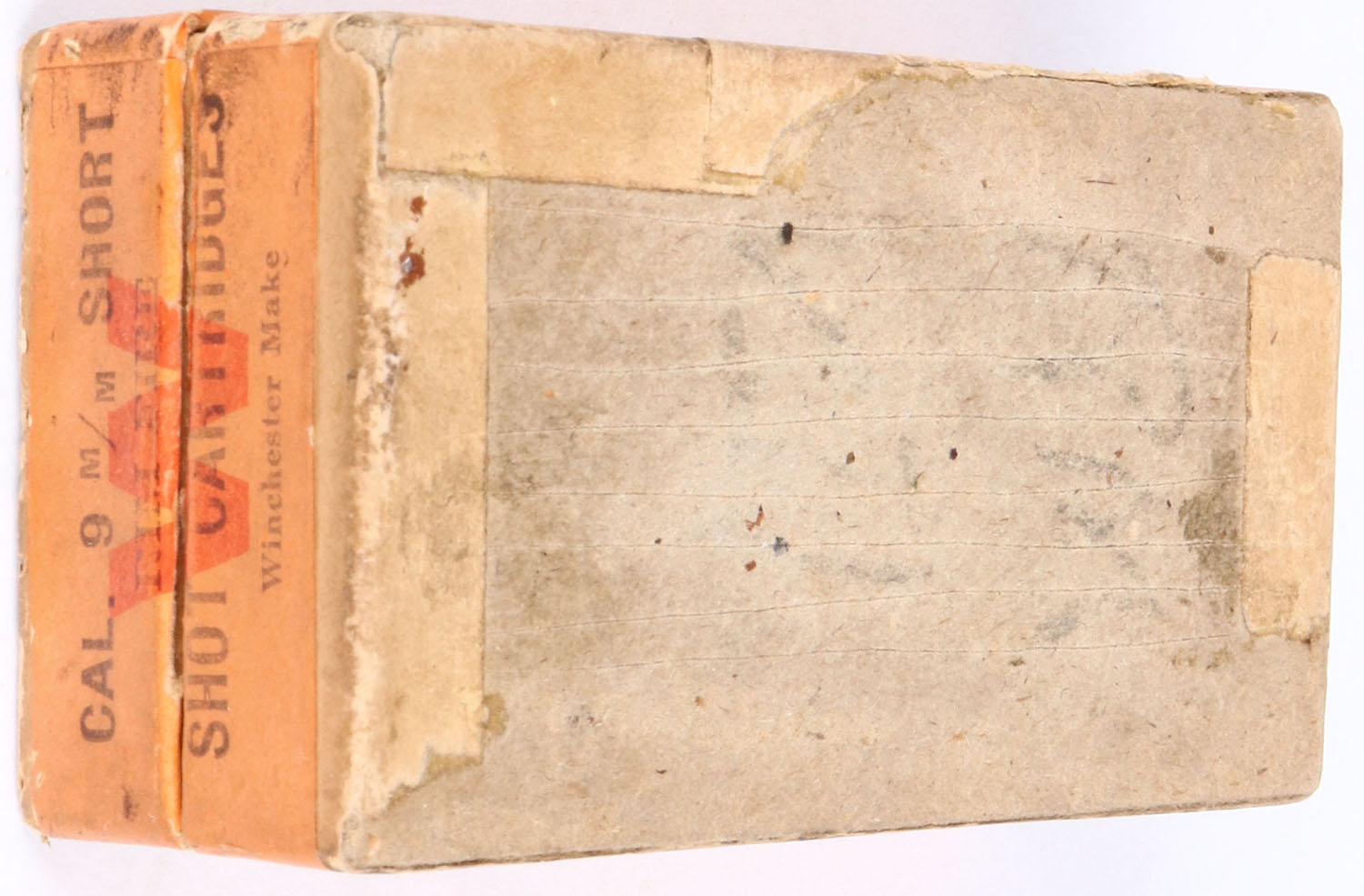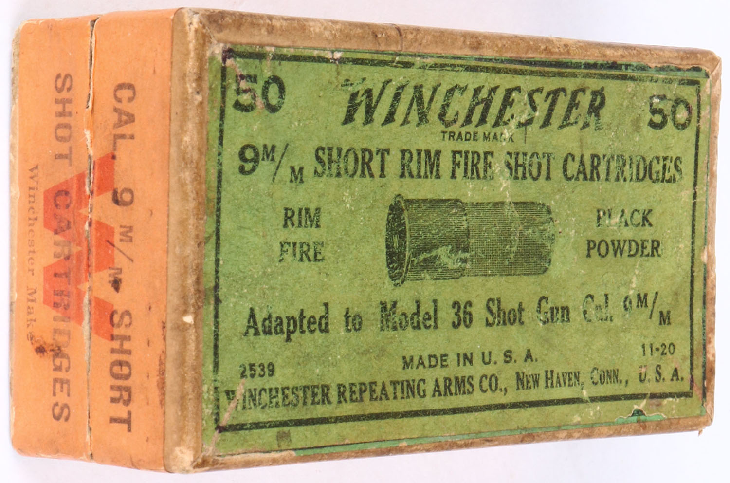 Winchester, 9mm Short Rim Fire Shot Cartridges, Blue shells, 2pc, Partial 25 Rds, buff box with green/orange label & black print, box is solid with faded label, rub marks, & edge wear, ammo is very good. Grade: Excellent - Value: 150 to 300
