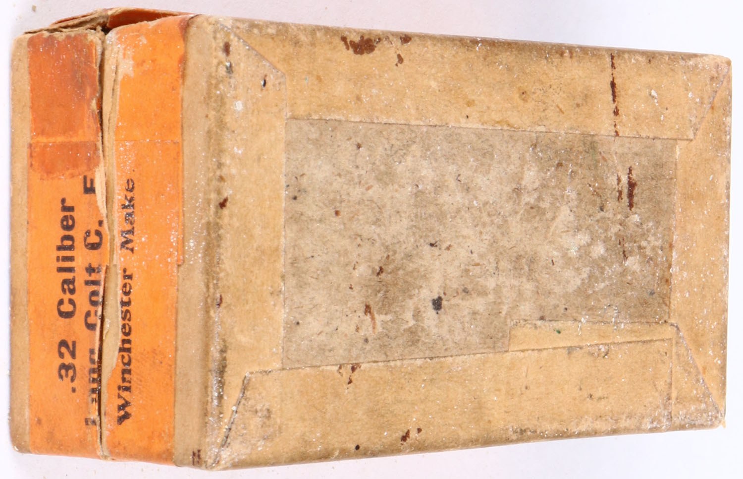 Winchester, .32 Long Colt, Solid Head, Full, 2pc. Buff box with green top & orange side sealing labels, box has two split corner seam on lid, light age soiling, light rub marks, & light edge wear, ammo is fair. Grade: Very Good ++ - Value: 40 to 80