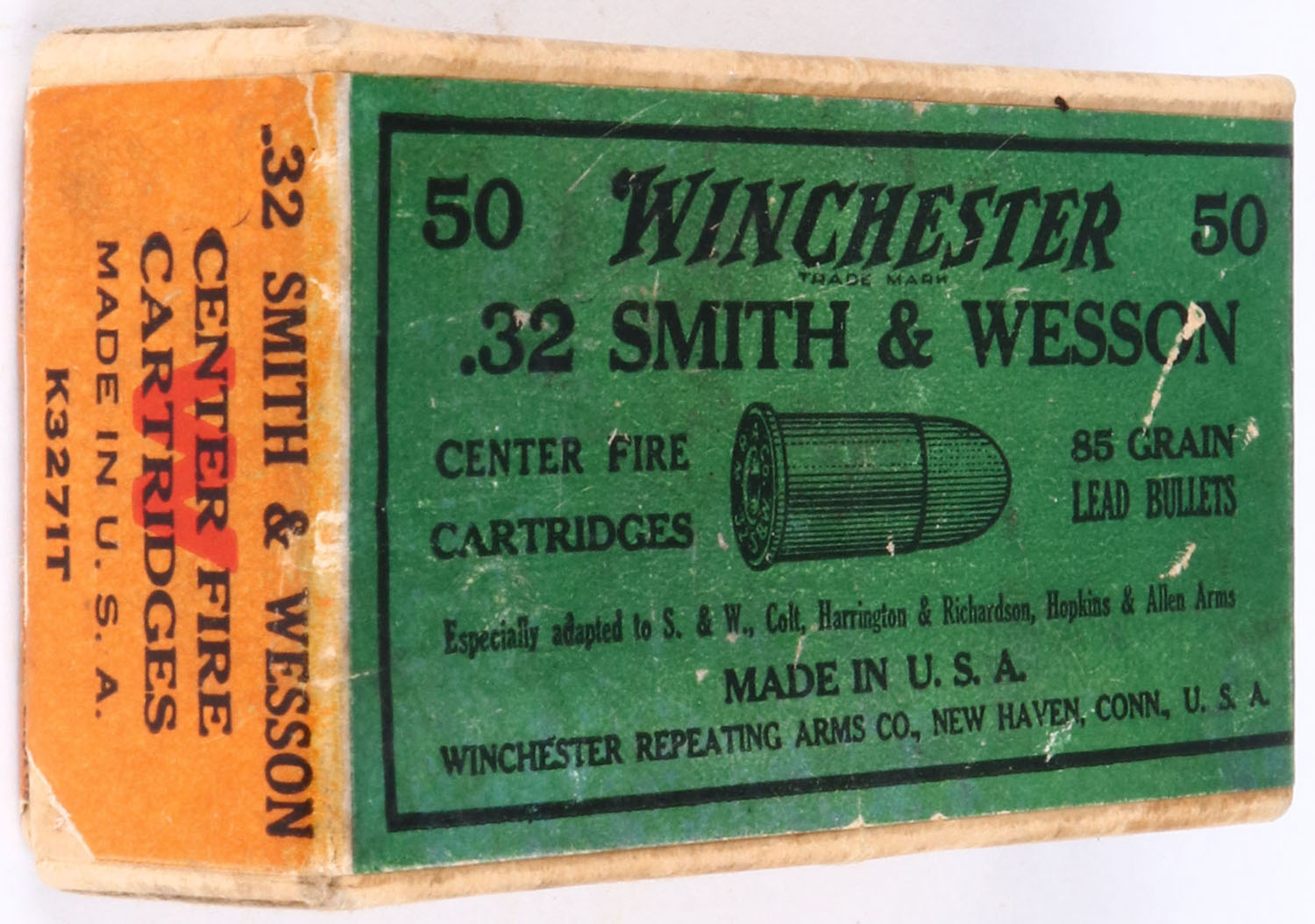 Winchester, .32 S&W, 85 Gr. Lead Bullet, 2pc, Full, buff box with green/orange label & black print, box is solid with excellent color, partial tear in box on front side, light rub marks, & minor edge wear, ammo is good. Grade: Excellent - Value: 30 to 90