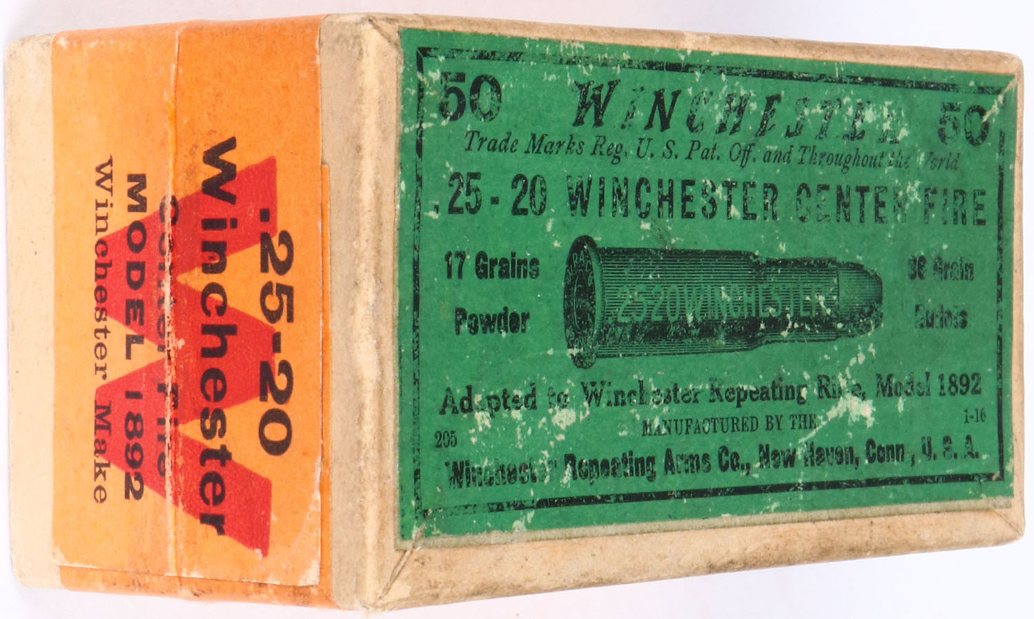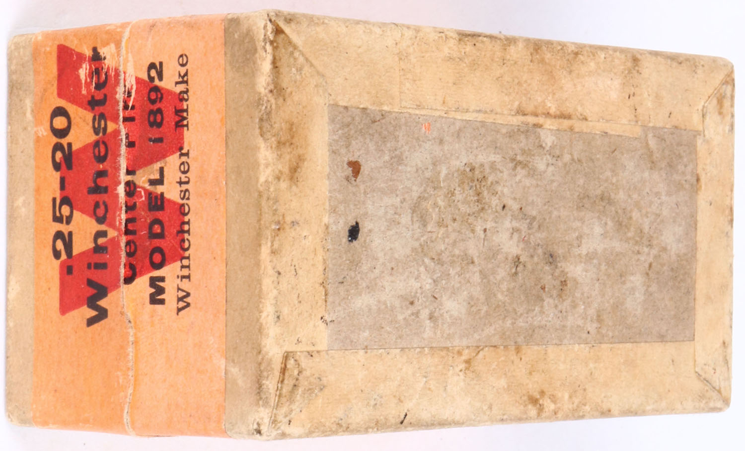 Winchester, .25-20 Winchester, 17 Grs. Of powder, 86 Gr. Bullet, 2pc, FULL & SEALED, buff box with green/orange label & black print, box is solid with very good color, rub marks, & light edge wear. Grade: Excellent - Value: 100 to 400