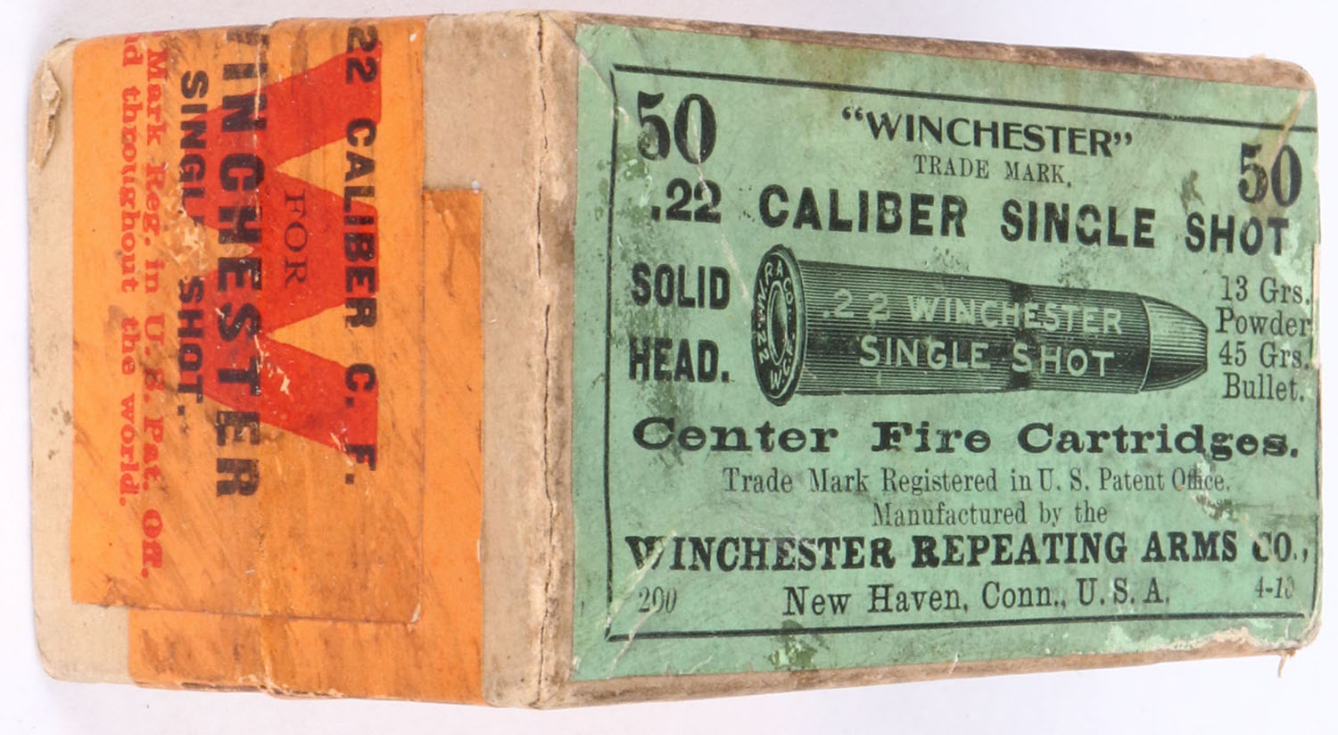 Winchester, .22 Winchester Single Shot, CF, 13 Grs. Powder, 45 Gr. Bullet, 2pc, FULL & SEALED, buff box with yellow/green label & black print, box is solid with light age soiling, rub marks & light edge wear. Grade: Very Good ++ - Value: 100 to 200