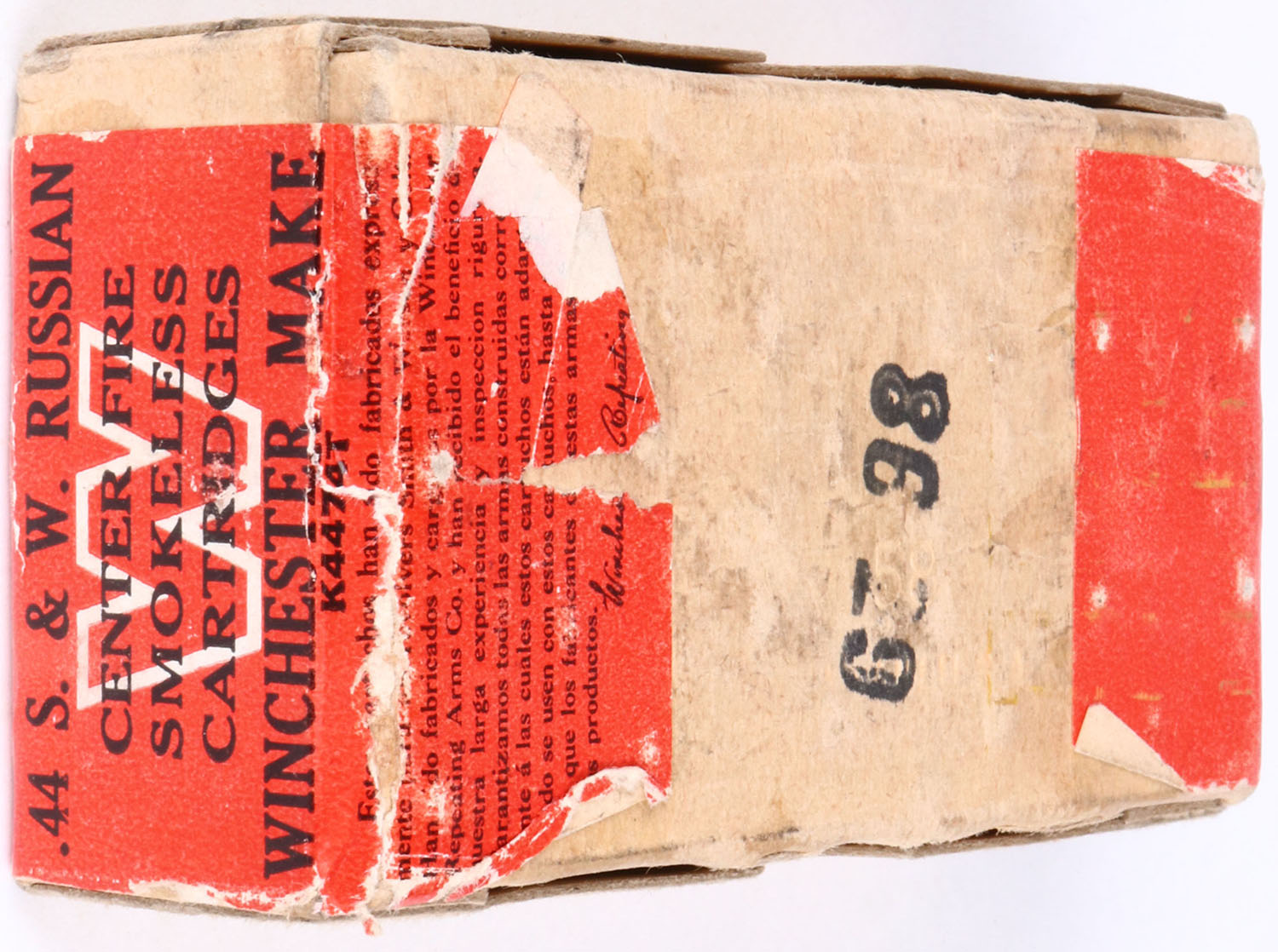 Winchester, .44 Smith & Wesson Russian, Staynless, 246 Grain Lead Bullet, FULL & SEALED, 2pc. Buff box with red wraparound label & black print, box is solid with excellent color, box is solid with pen/pencil marks, small tears in top label, rub marks, & edge/corner wear. Grade: Excellent - Value: 50 to 200