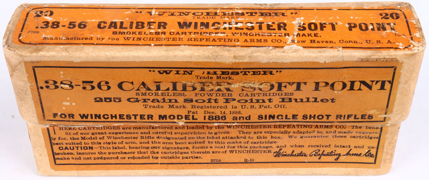 Winchester, .38-56 Winchester, Smokeless, 255 Gr. Soft point bullet, 2pc, Full, buff box with orange label & black print, box is solid with very good color, light staining, light rub marks, & light edge wear, ammo is excellent. Grade: Excellent - Value: 60 to 180