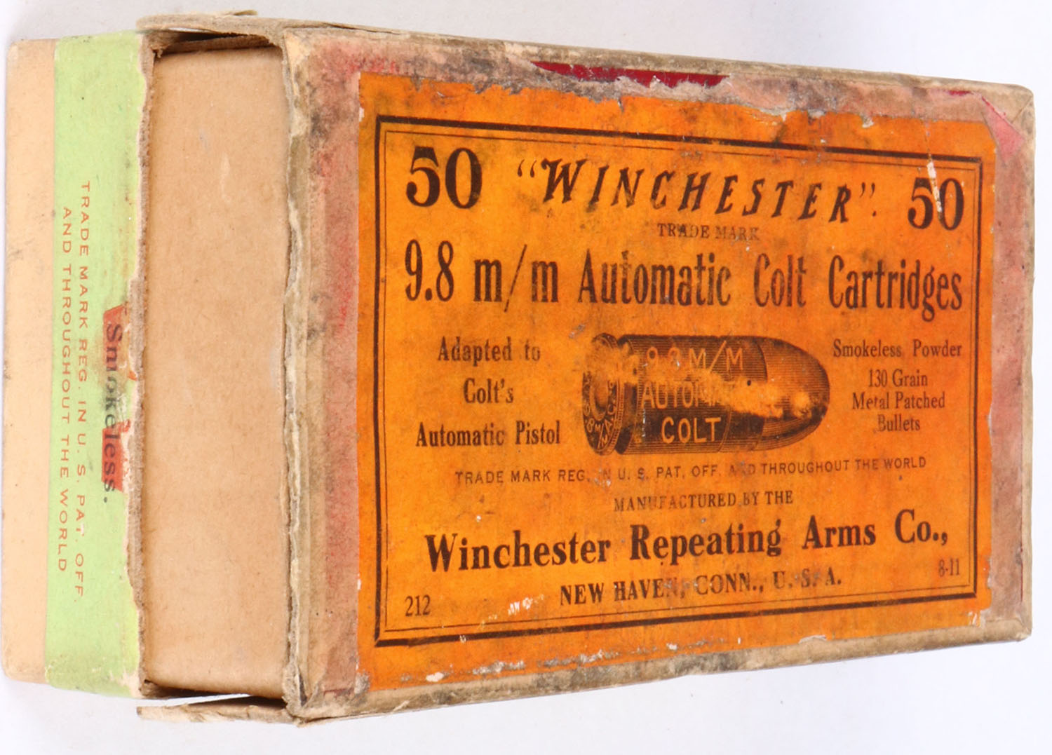 RARE!! Winchester, 9.8mm Automatic colt, Smokeless, 130 Gr. Patched bullet, made only in 1910-1911, 2pc, Full, buff box with orange/green label & black print, box is missing the left end flap on lid, tape repairs on two corner seams on lid, light age soiling, rub marks, & edge wear, ammo is very good.* Grade: Very Good + - Value: 800 to 1200