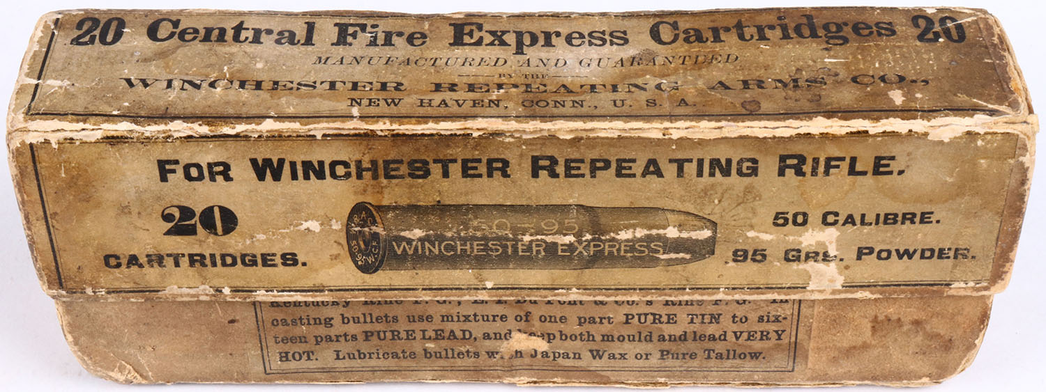 Winchester, .50-95, 20 Central Fire Express Cartridges, For Winchester Repeating Rifle, 2pc., Full, Buff box with black printing,, box has seam split on bottom right end from front to back, seam split on front of lid has been glued from the inside, age soiling, edge wear, ammo is excellent. * Grade: Very Good - Value: 700 to 1200