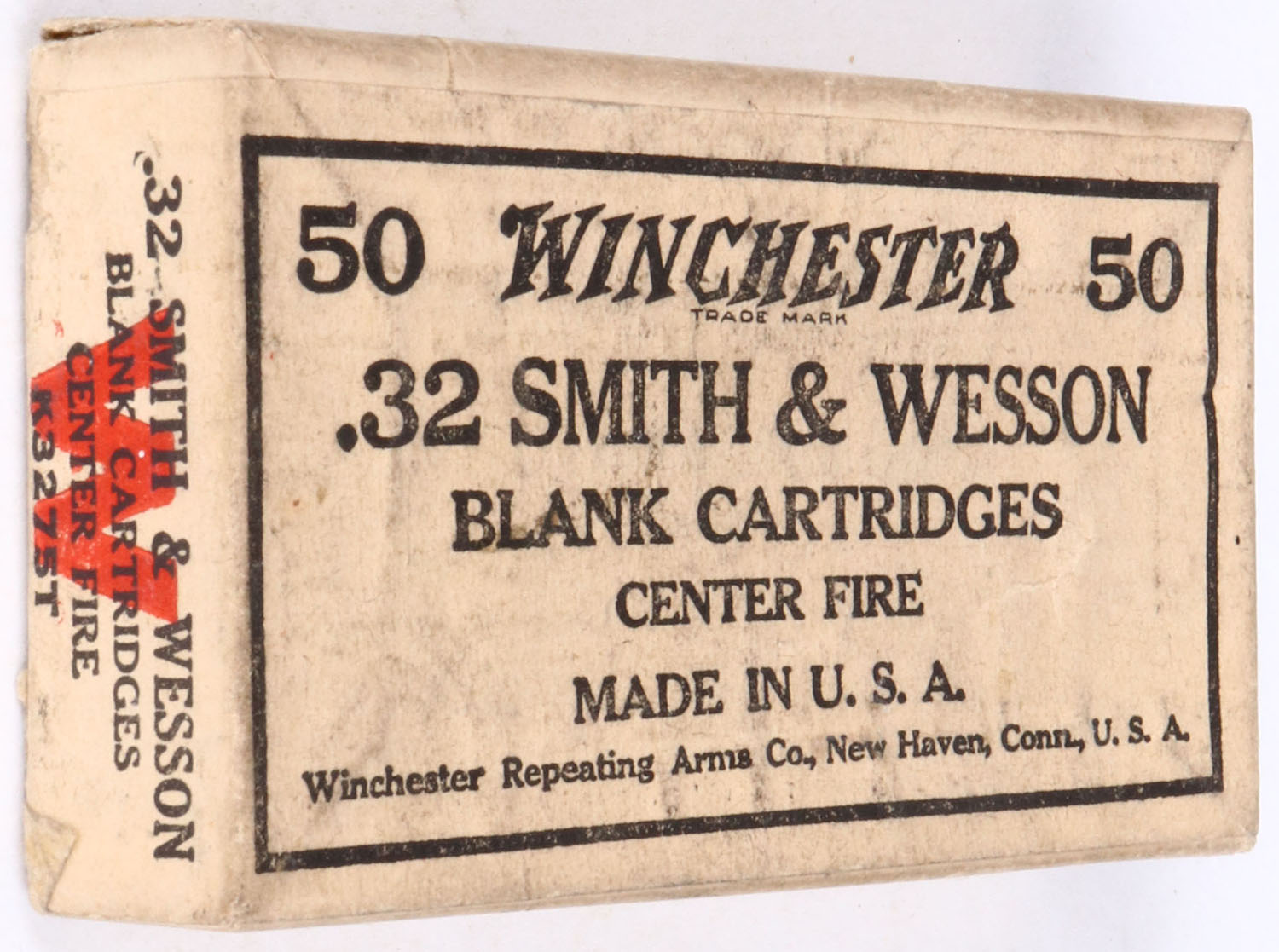Winchester, .32 Smith & Wesson Blank Cartridges, Partial 46 Rds., 2pc. Buff box with buff wraparound label, box has three corner seam splits on lid, light age soiling, minor rub marks & light edge wear, ammo is very good to good. Grade: Very good ++ - Value: 10 to 30
