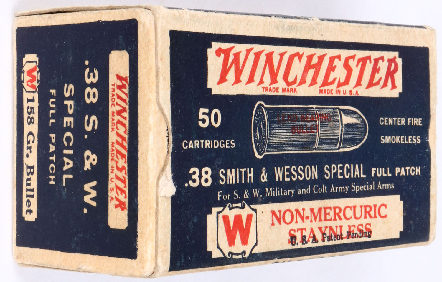 Winchester, .38 S&W Special, OVERSTAMP ''LEAD BEARING BULLET'', Non-Mercuric, Staynless, OVERSTAMP U.S.A. Patent Pending, Oil Proof, 158 Gr. Full patch Bullet, Full, 1pc. Blue white & red box, box is solid with excellent color, minor rub marks, & light edge wear, ammo is excellent. Grade: Excellent ++ - Value: 200 to 600