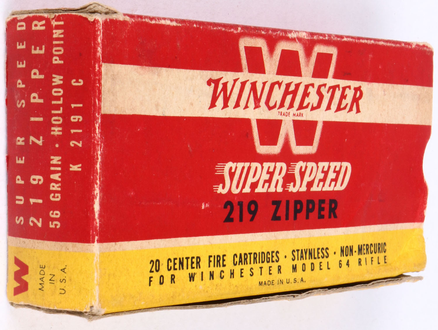 Winchester, .219 Zipper, Super Speed, 56 Gr. Hollow point Bullet, 1pc, Full, red & yellow box with white & black print, box is solid with light age soiling, handling wear, rub marks & edge wear, ammo is Excellent. Grade: Very Good ++ - Value: 250 to 500
