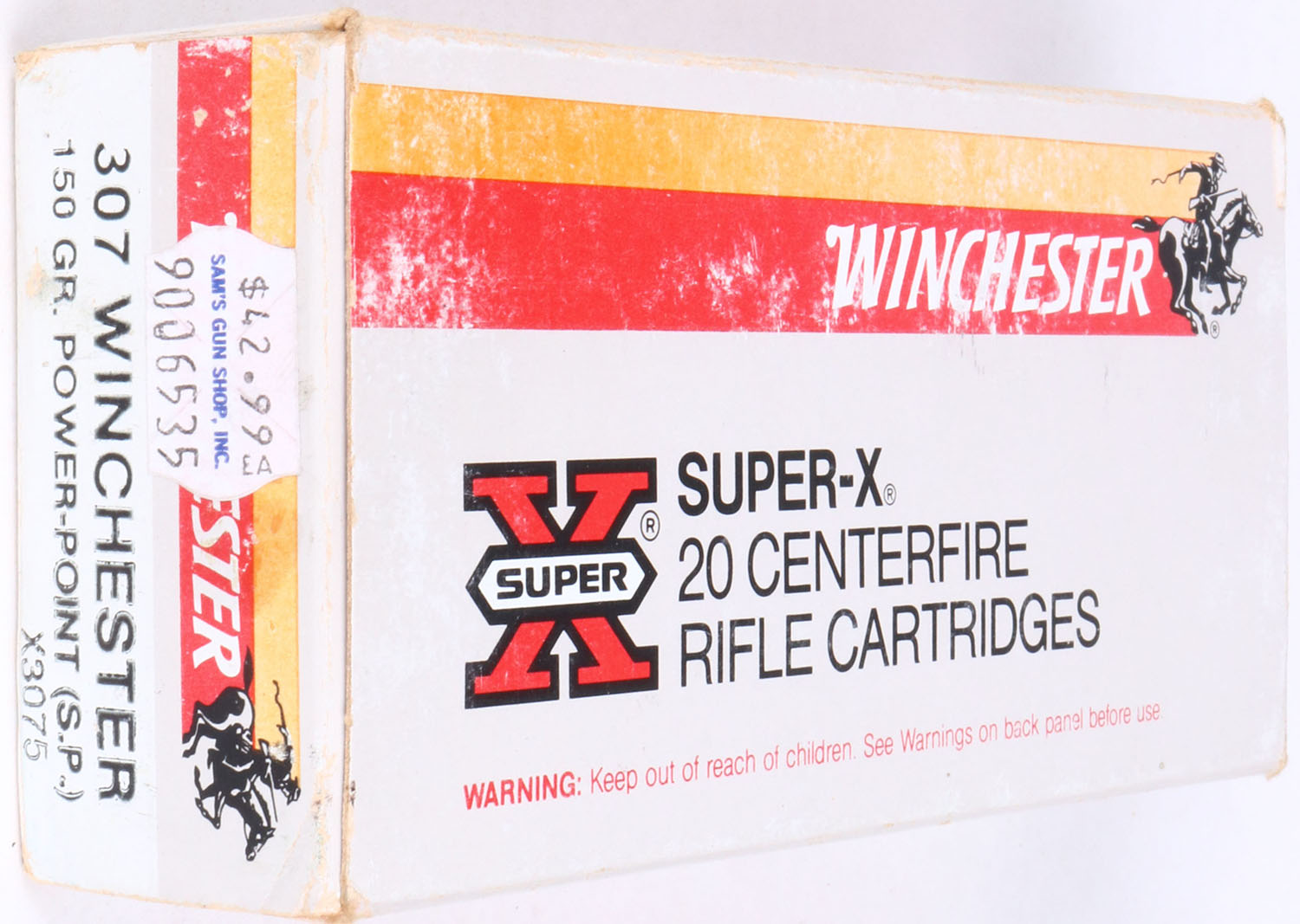 Winchester, Super-X, .307 Winchester, 150 Gr. Power Point (S.P.) bullet, 1pc, Full, white box with orange/red label & black/white print, box is solid with light wear & price sticker, ammo is excellent. Grade: Excellent - Value: 30 to 90