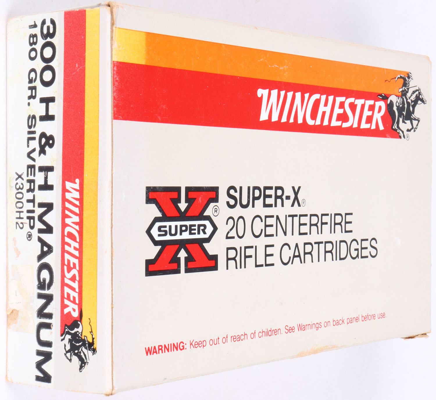 Winchester, Super-X, .300 H&H Magnum, 180 Gr. Silvertip bullet, 1pc, Full, Gray box with orange/red label & black/white print, box is solid with light wear & stickers, ammo is excellent. Grade: Excellent - Value: 30 to 90