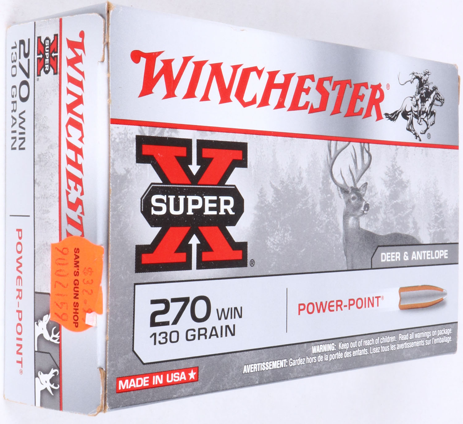 Winchester, Super-X, .270 Win., 130 Gr. Power Point bullet, 1pc, Full, gray box with black/red print, box is solid with light wear, ammo is excellent. Grade: Excellent - Value: 20 to 40