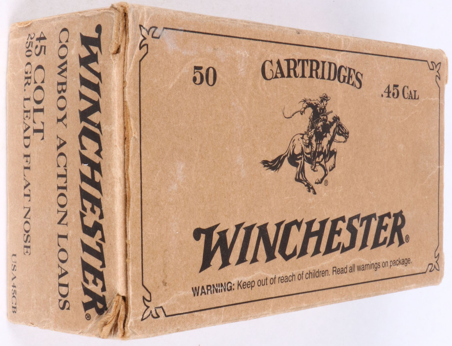 Winchester, .45 Colt, 250 Gr. Lead Flat Nose, Cowboy action loads, 1pc, Full with about Half correct ammo & half mixed, buff box with black print, box is solid with handling wear, ammo is excellent. Grade: Excellent - Value: 20 to 40