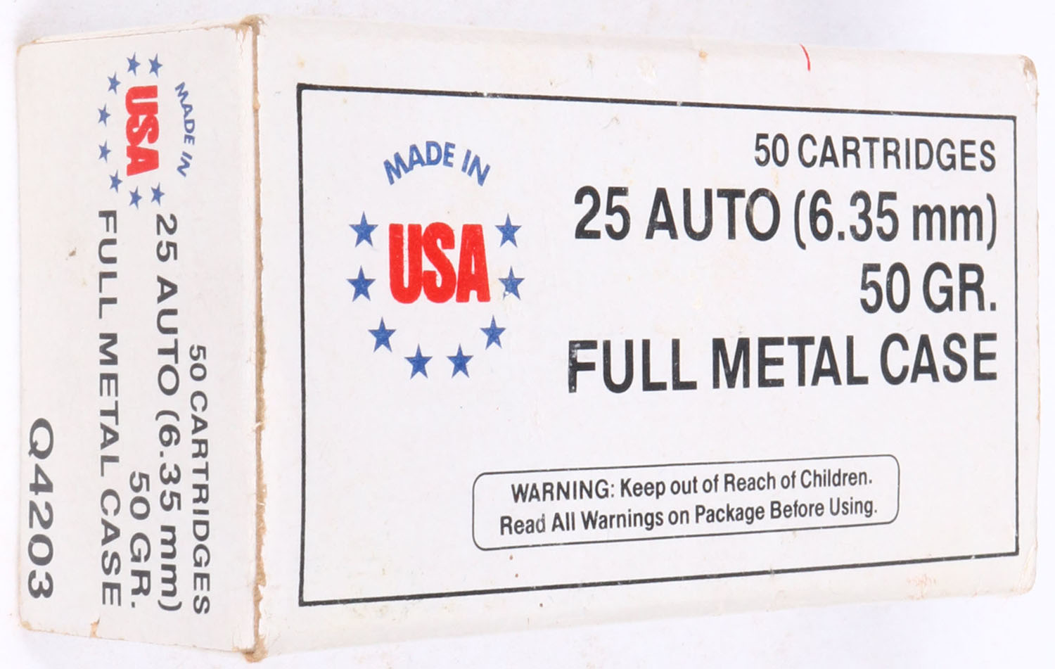 Winchester, .25 Auto (6.35mm), 50 Gr. FMC, 1pc, Full, white box with black/red print, box is solid with light wear, ammo is excellent. Grade: Excellent - Value: 20 to 60